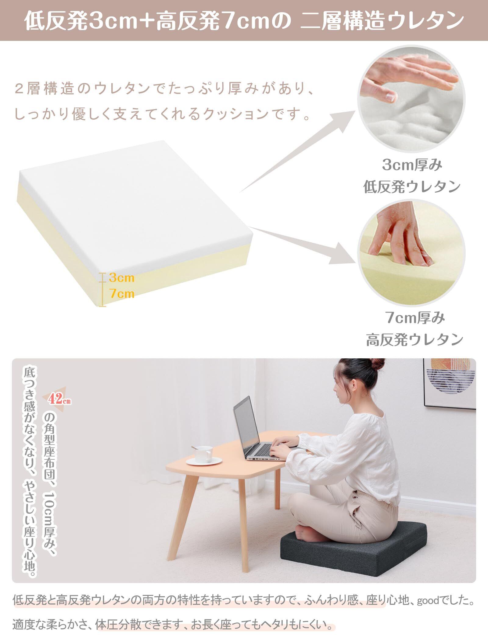 【2層構造・両面可用】低反発3cm+高反発7cmの2層構造ウレタン、低反発と高反発の両方の特性を持っていますので、ふんわり感、座り心地、goodでした。カバーを取り外してウレタンの上下を調整、個人の好みによって違う体験になります。
