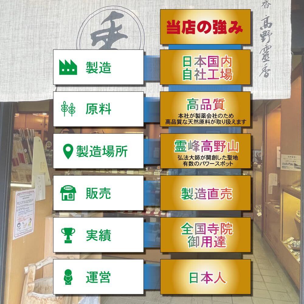 世界文化遺産・高野山の地で製造された特別なお線香です。真言密教の聖地として知られる高野山の伝統と歴史に培われた製法により、その品質はひときわ高く、お線香としての価値をいっそう引き立てています。
