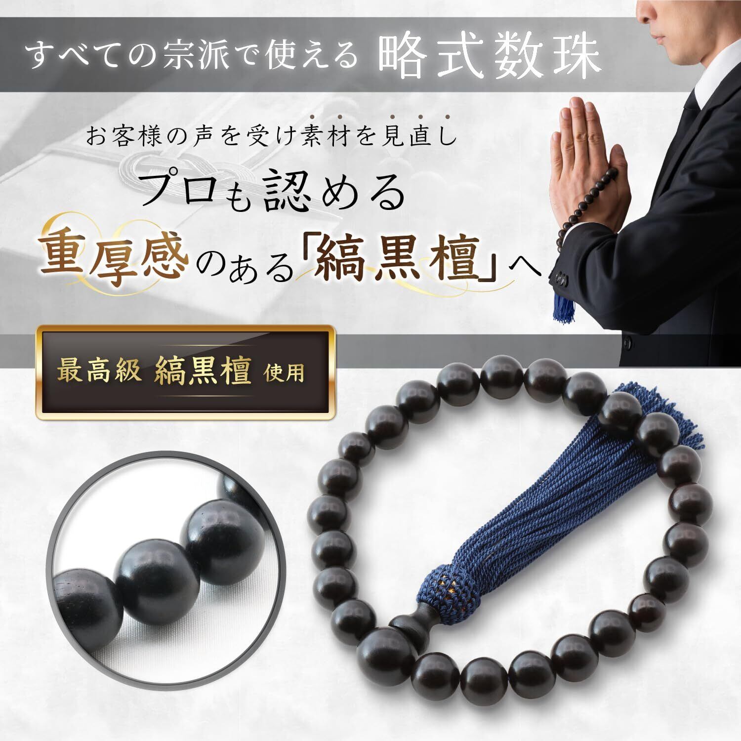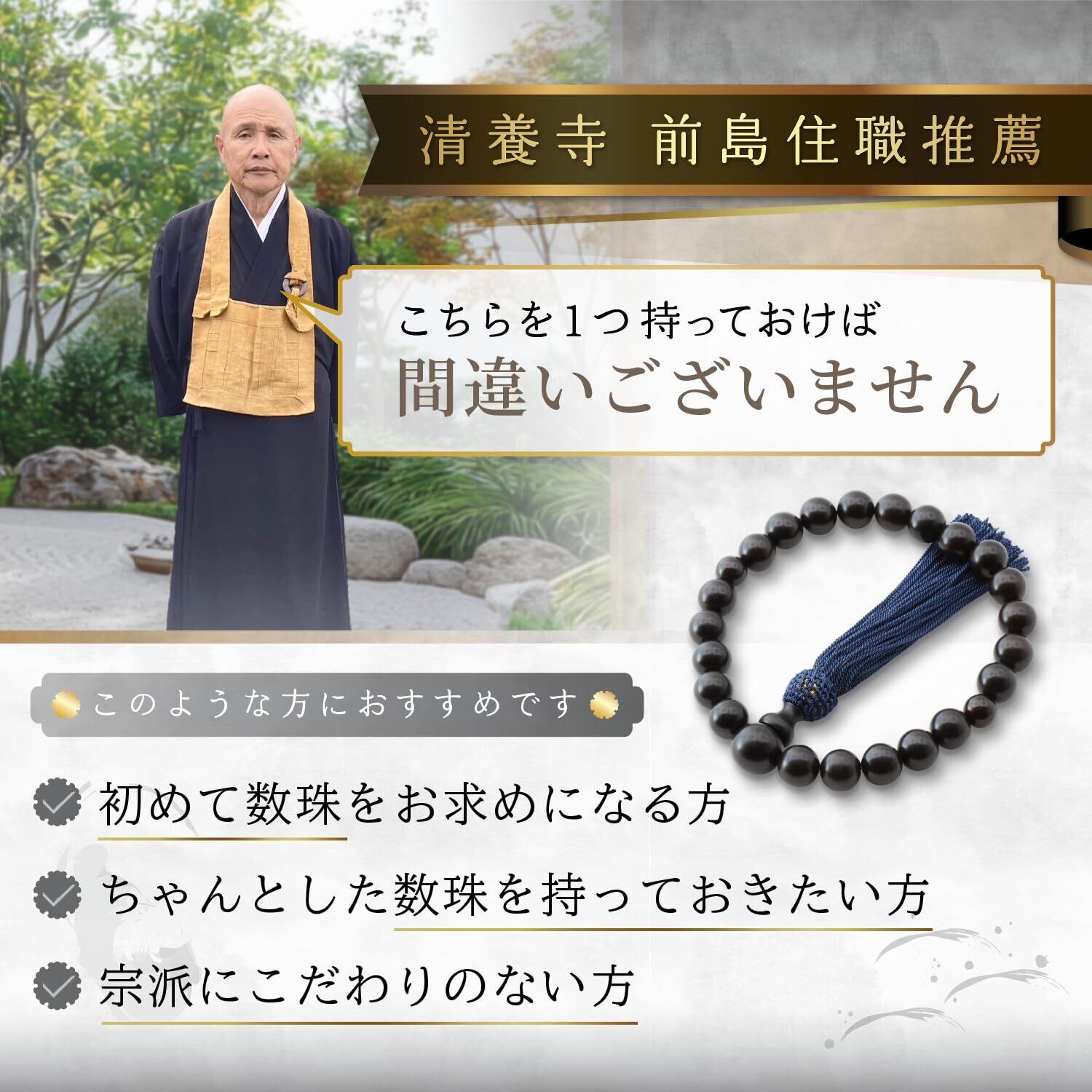 【静養寺 前島住職推薦】全宗派で利用可能な 男性用 略式 数珠です。一つあれば、葬儀や法事の場面で安心してご利用いただけます。