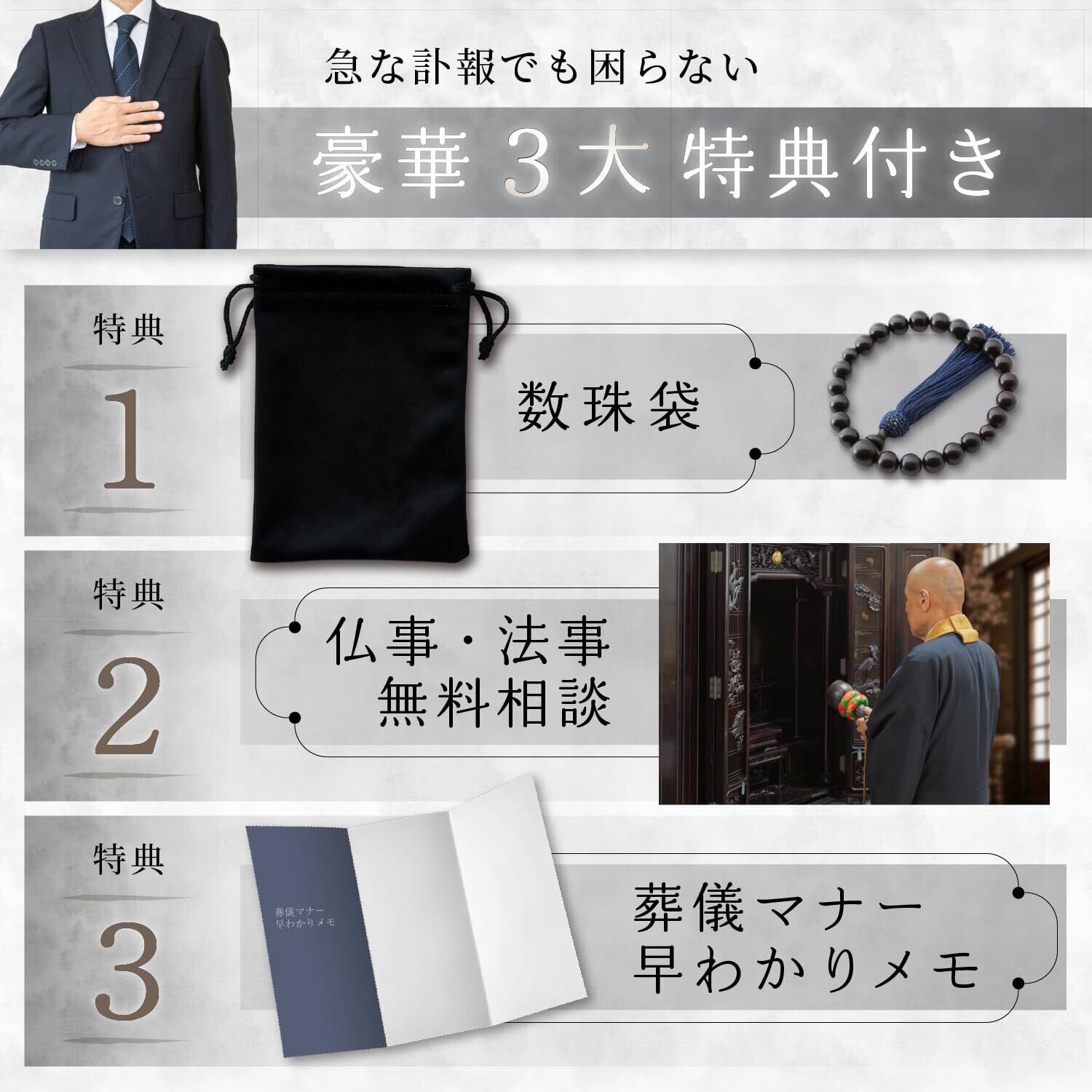 【豪華3大特典付き】数珠袋、葬儀マナーガイド、仏事・法事無料相談の3つが付属。急な訃報にも困らず、安心して仏事の準備が整います。