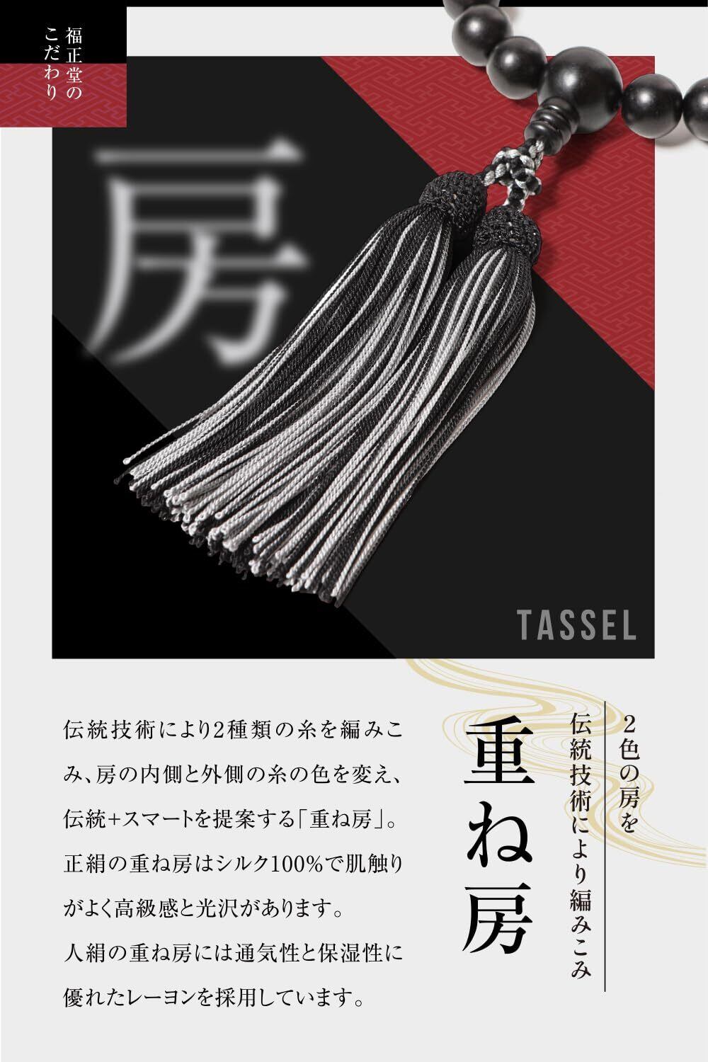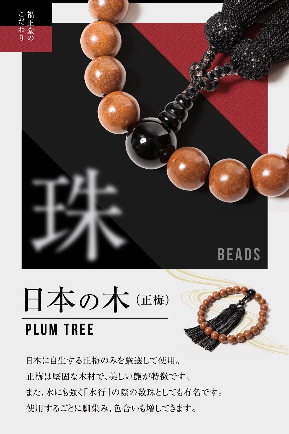 伝統と新しさの融合、重ね房シリーズ 男性用数珠 珠 日本の木(正梅) 日本に自生する正梅のみを厳選して使用。 正梅は堅固な木材で、美しい艶が特徴です。 房 重ね房の正絹です。