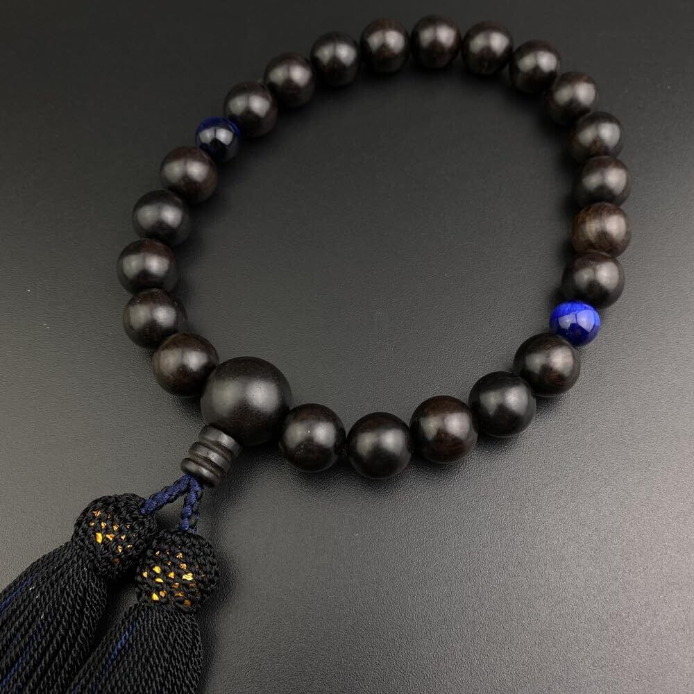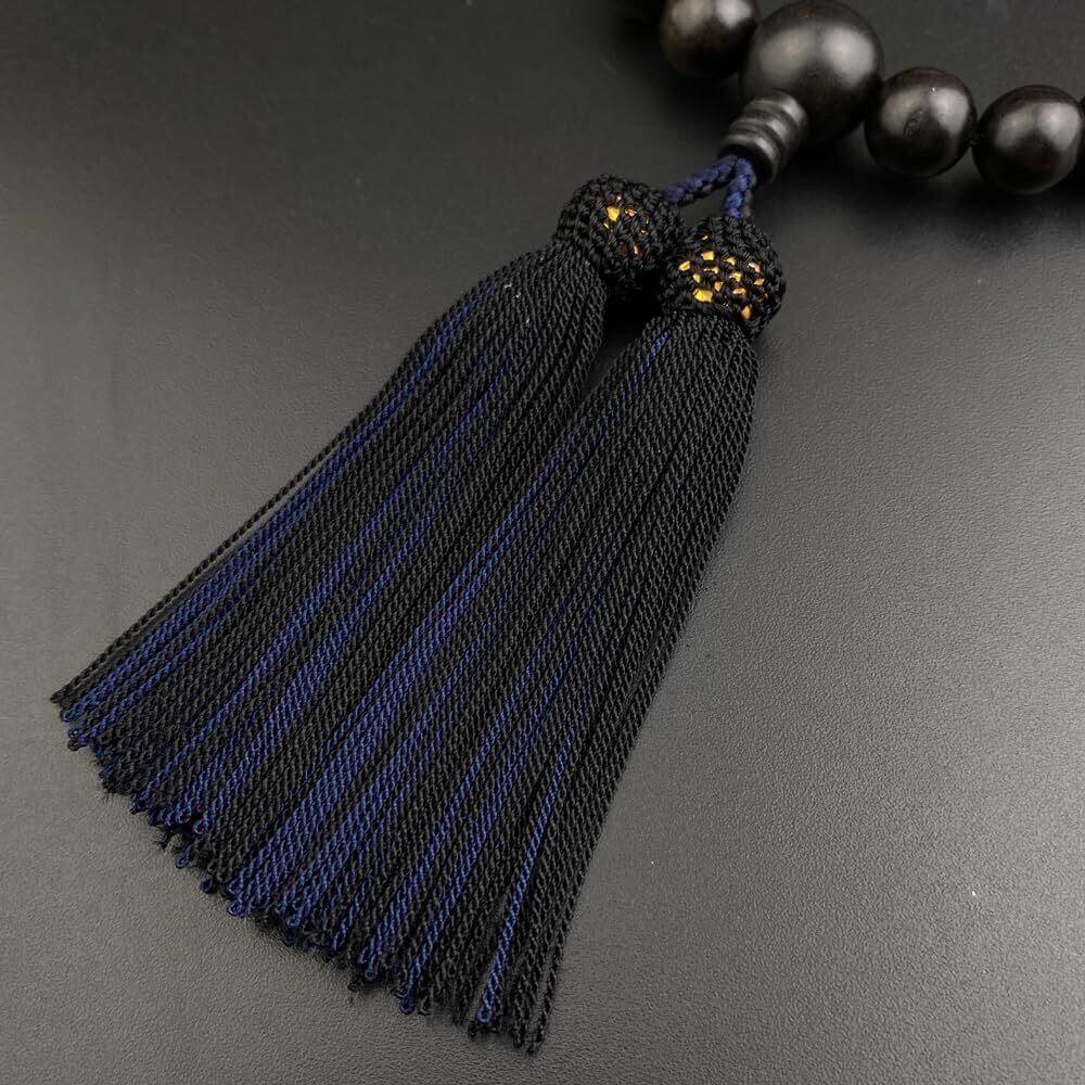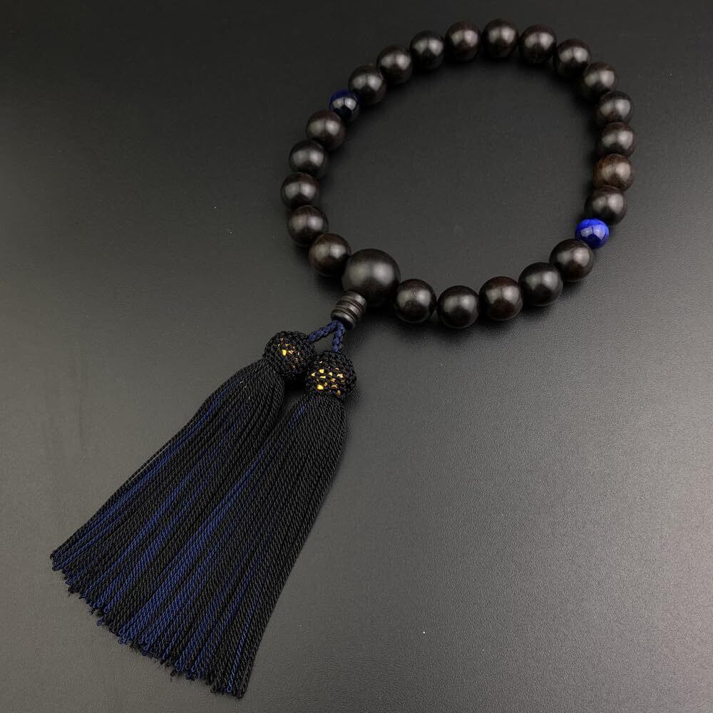 葬儀、お通夜、法事、お墓参りにて、すべての宗派のお客様にお使いいただける男性用の「略式数珠」でございます。素材は、いつも人気な黒檀でございます。黒檀の木材は銘木として古くからよく知られ、製品の素材に用いられる心材の材質の特徴としては漆黒の色合いで緻密かつ重厚かつ堅固である点が挙げられる。アクセントには、青虎目石を使用させて頂きました。房は素材と合わせ、お洒落な黒/鉄紺2色房でございます。