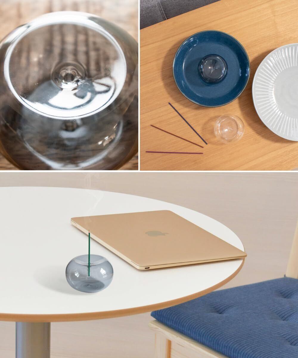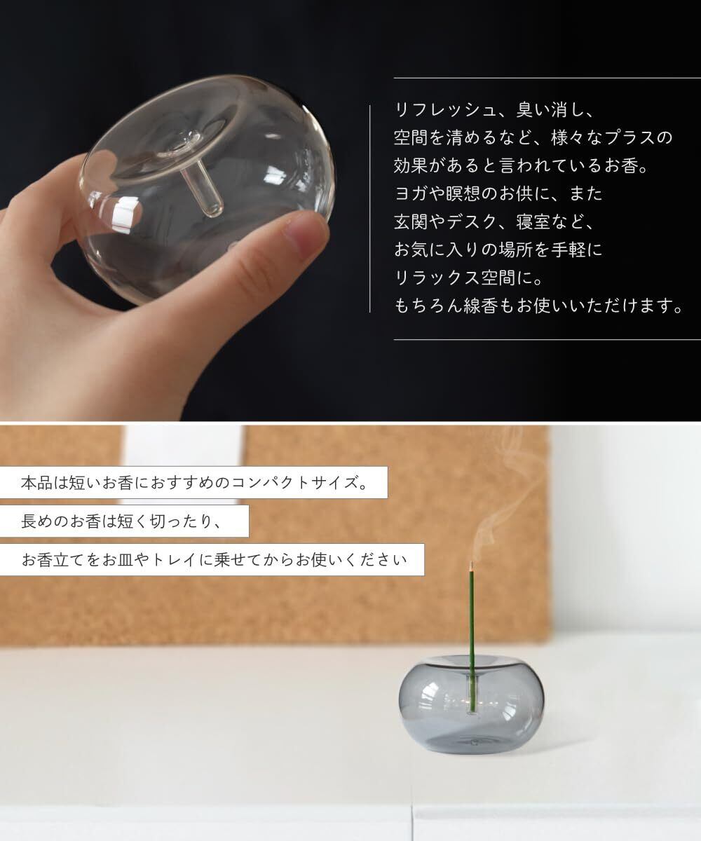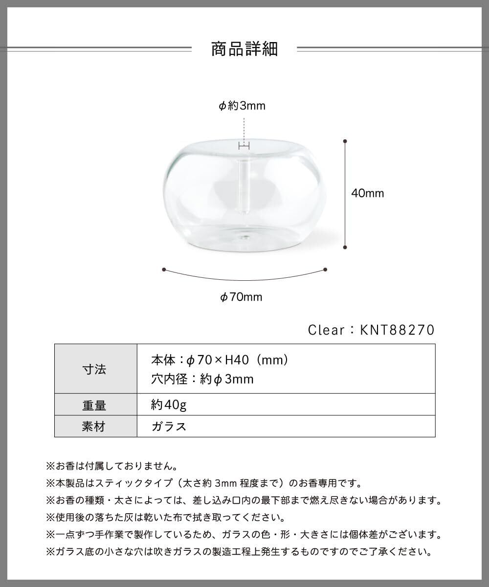 『ご注意』※お香は付属しておりません。※本製品はスティックタイプのお香専用です。※お香の種類・太さによっては、差し込み口内の最下部まで燃え尽きない場合があります。※一点ずつ手作業で製作しているため、ガラスの色・形・大きさには個体差がございます。※ガラス底の小さな穴は吹きガラスの製造工程上発生するものですのでご了承ください。