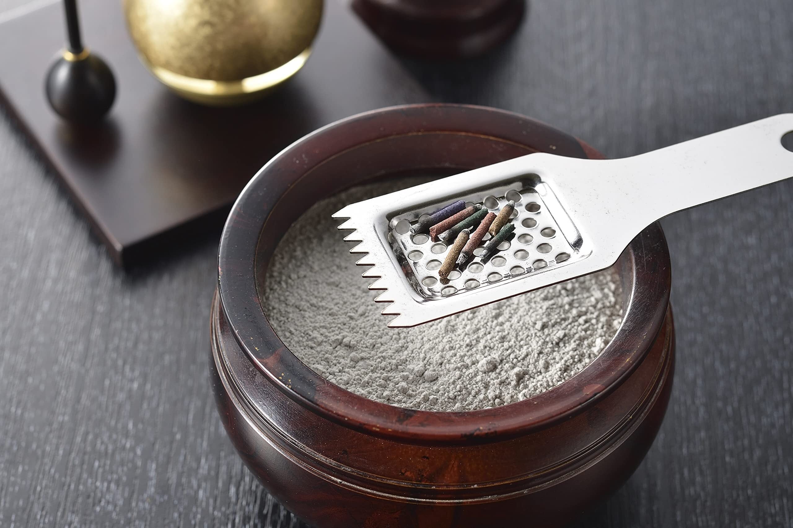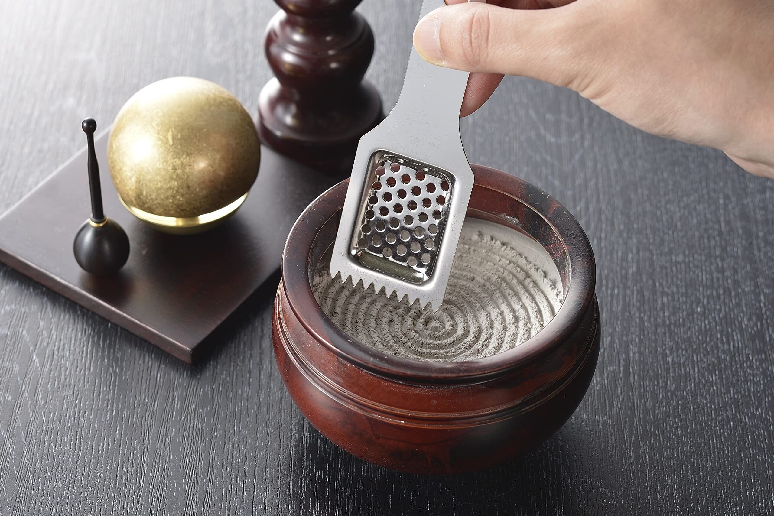 灰取りは、香炉に残った線香の燃えカスだけを拾って、灰は穴から抜ける様になっています。