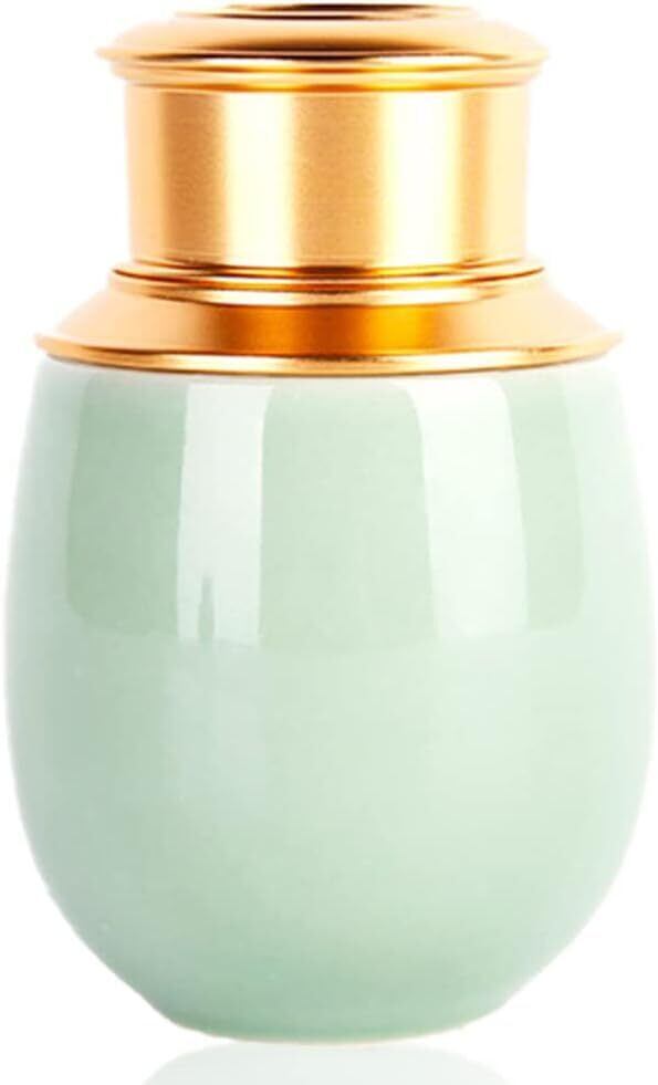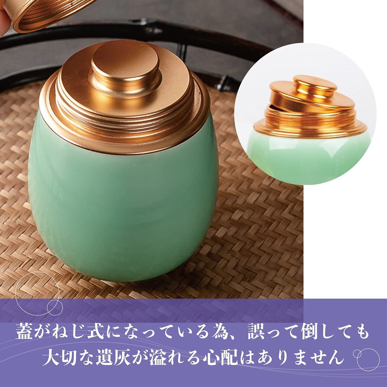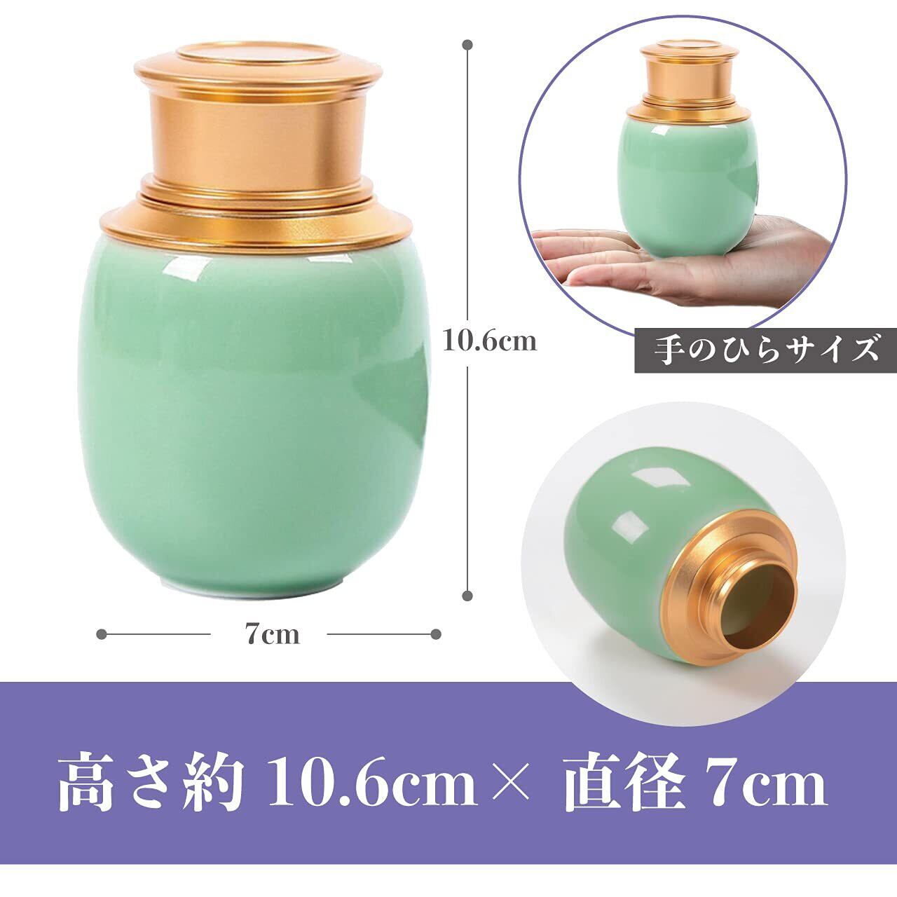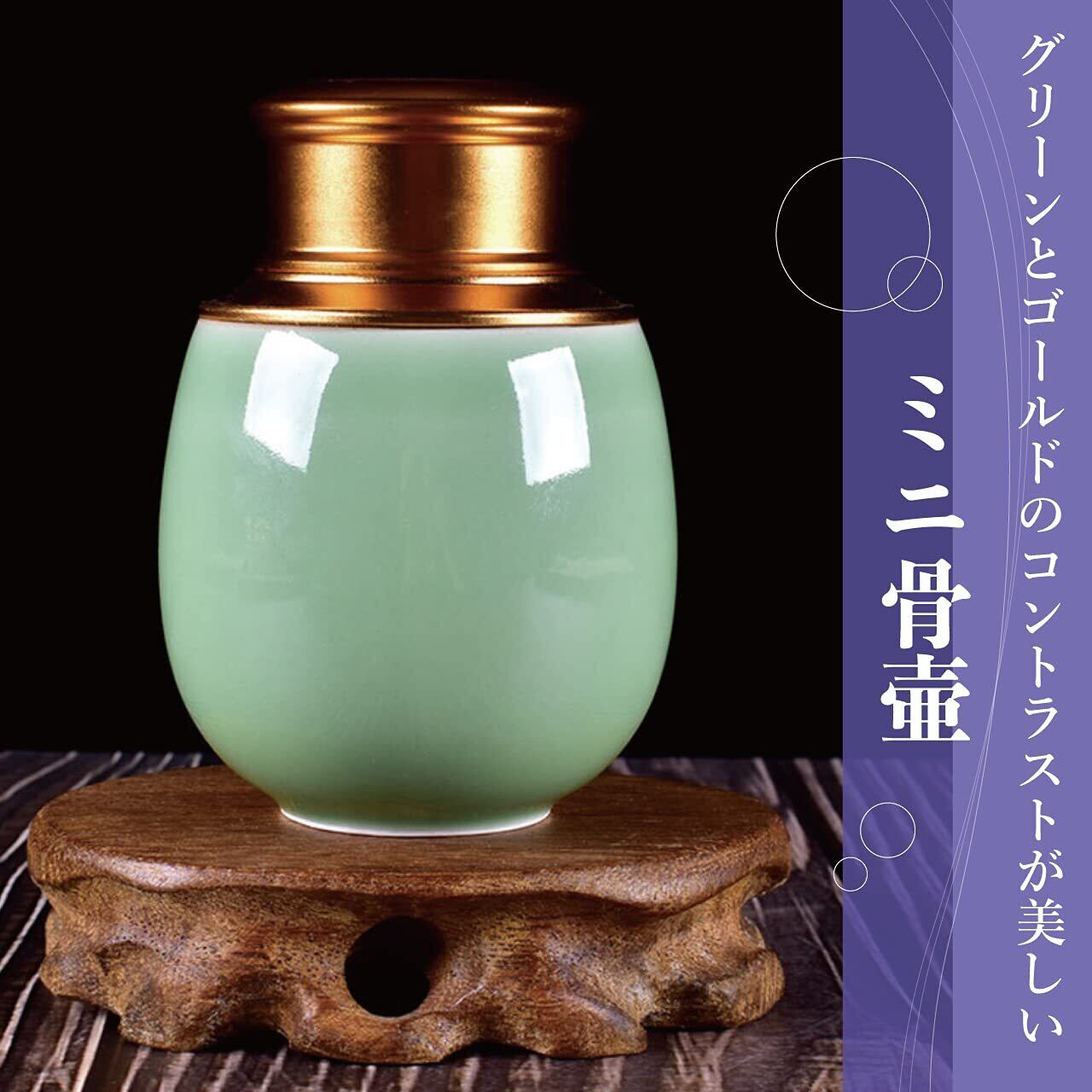 【特徴】美しい青磁とゴールドのコントラストが美しい骨壺です。一般的なミニ骨壺に比べ容量が200mlと大きいので、より多くの遺骨を納められます。蓋がねじ式なので、倒れて大切な遺灰がこぼれる心配がありません。コンパクトサイズなので、仏壇をはじめキャビネットの上など、ご安置する場所を選びません。