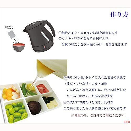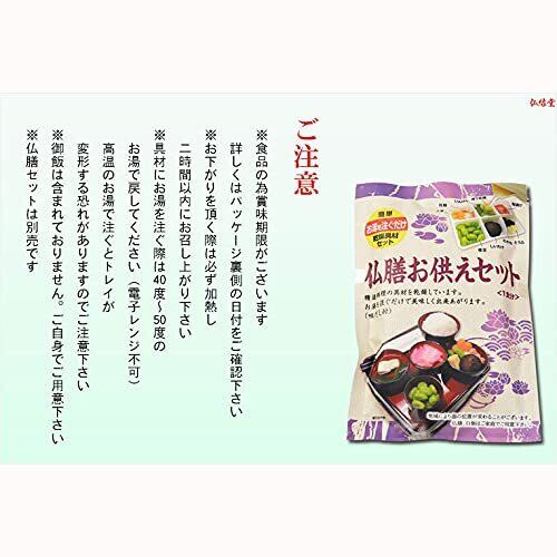 ・ご注意 ※食品の為賞味期限がございます、詳しくはパッケージ裏側の日付をご確認下さい ※お下がりを頂く際は必ず加熱し二時間以内にお召し上がり下さい ※具材にお湯を注ぐ際は40度~50度のお湯で戻してください(電子レンジ不可) 高温のお湯で注ぐとトレイが変形する恐れがありますのでご注意下さい ※御飯は含まれておりません ※仏膳セットは別売です ※予告なくメーカー都合によりパッケージデザイン 具材の種類が変わる場合がございます ※写真の仏膳セットは別売です