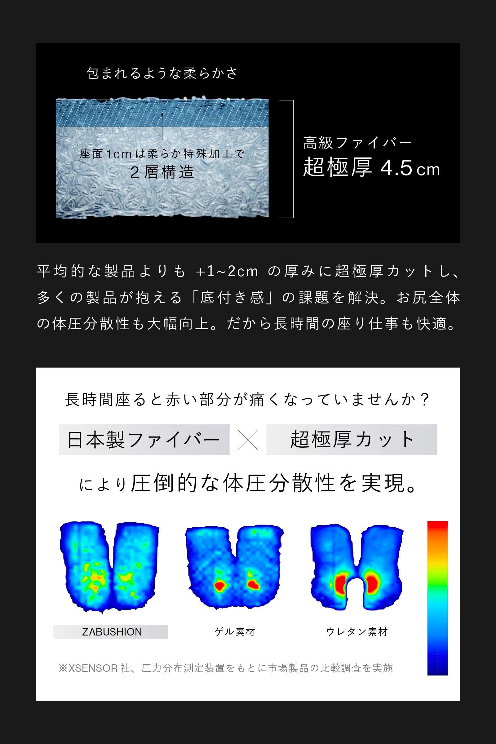 【着座専門ブランド / 中材4.5cm 贅沢な厚み】「あと1~2cmの厚みが欲しい」というお声を反映し、従来製品のヘタり・底付き感・蒸れの悩みを圧倒的解消。長時間座る環境にこだわる方に選ばれ、へたりにくく、体圧分散性と通気性に優れた日本製・超極厚ファイバーが特徴です。