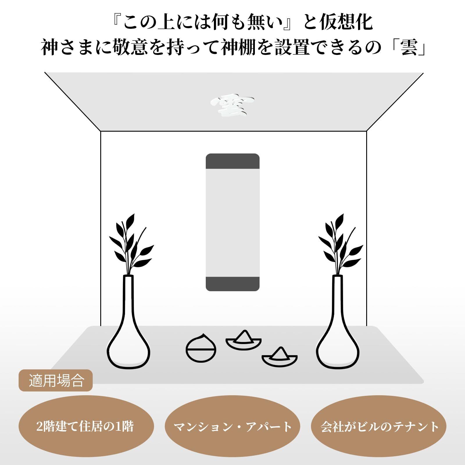 【雲を飾るという風習】神棚の上には空だけが広がる、という事を示すために、昔から「雲」などの文字を壁や天井に貼る風習がありました。住環境の変化により、神棚より上の階がある場合や、設置場所に制限があるときなどに、神さまに敬意を込めて生まれた風習と言われています。「ここの上は天で上には何もありません」ということを表します。