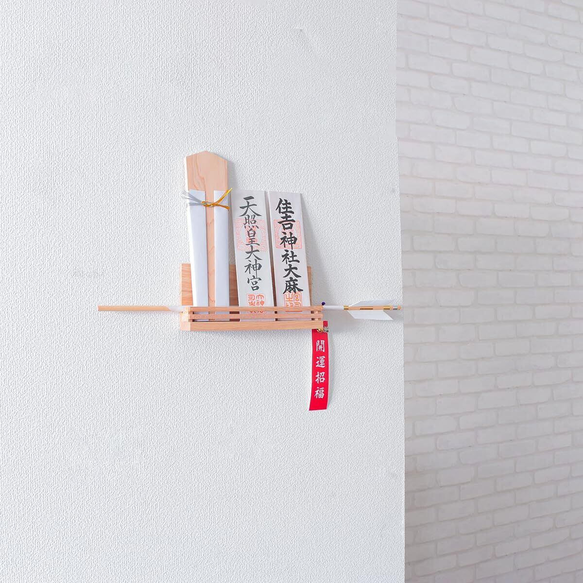 通常配られる頒布大麻を3枚お祀りすることができ、破魔矢も掛けることができます。 置き型としても壁掛けとしてもご利用いただけます。