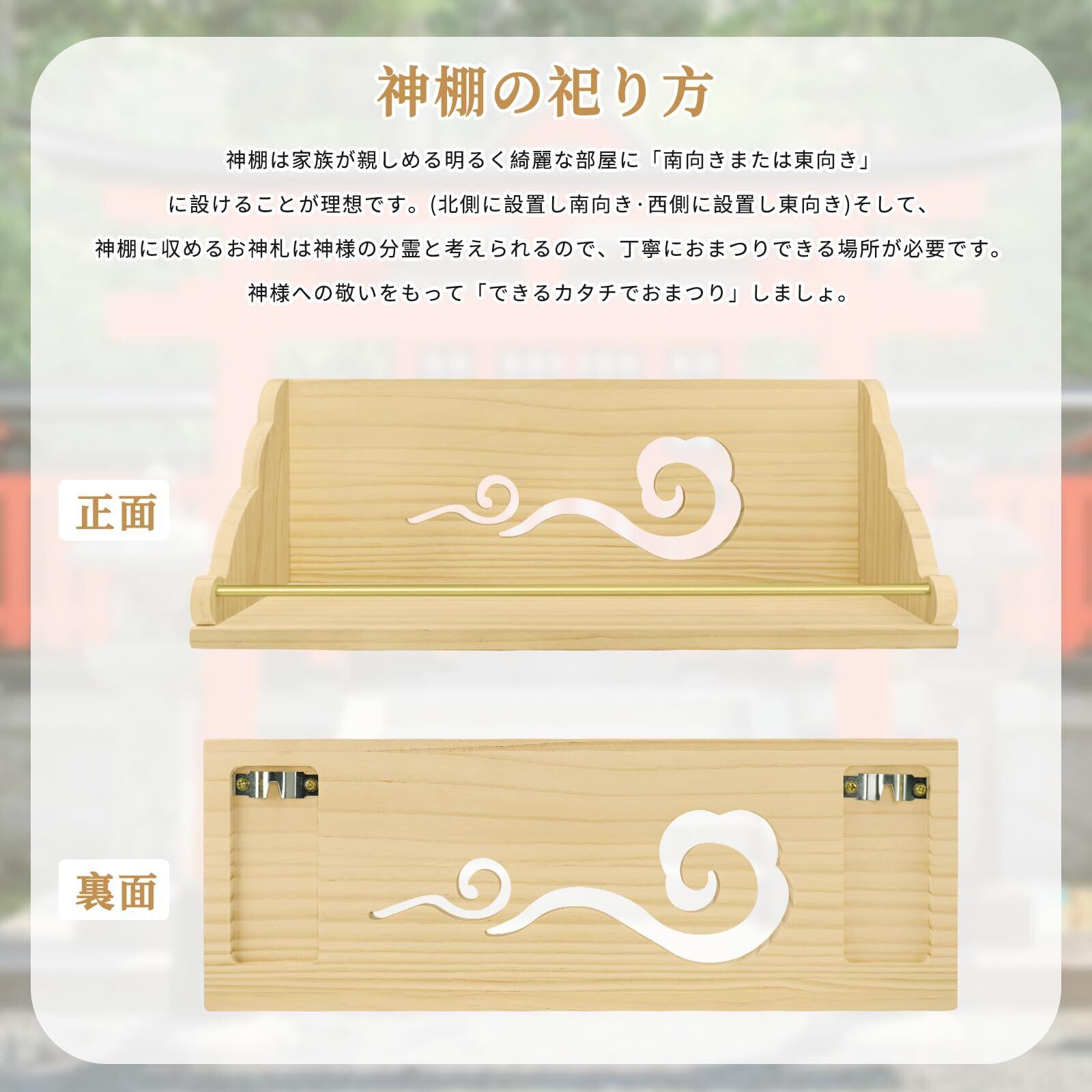 【 理想的な設置場所と方角】神棚は、明るく清浄で、日当たり・風通しの良い場所に、高い位置(目線より上日々拝むのに適した高い位置に設置するのが良いとされている。方角は南向きまたは東向きに設置するのが基本とされる。実際には最上階(または上に上階の床のない箇所)の天井近くに最上階への設置が難しい場合でも付属の「雲板」を用いることで、神様のおわす空間を清浄に保つお手伝いをいたします。