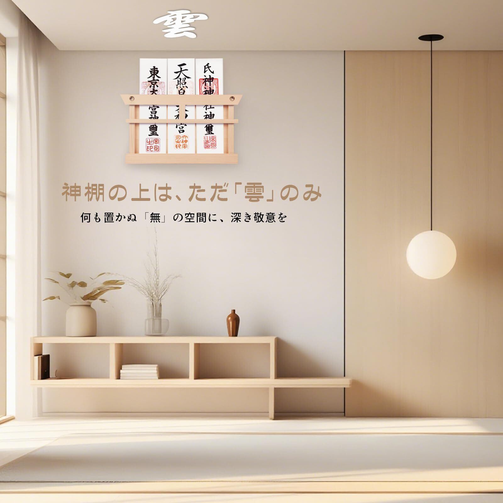 「雲 神棚の材質」神棚 天は紙製ではなく、軽量で耐久性のある発泡PP素材を採用しています。変形しにくく、防水・防湿性に優れており、長期間使用しても美しい純白を保つことができます。和風・洋風どちらのお部屋にもなじみやすく、モダンな神棚やお札入れとも相性の良い、やさしいデザインです。