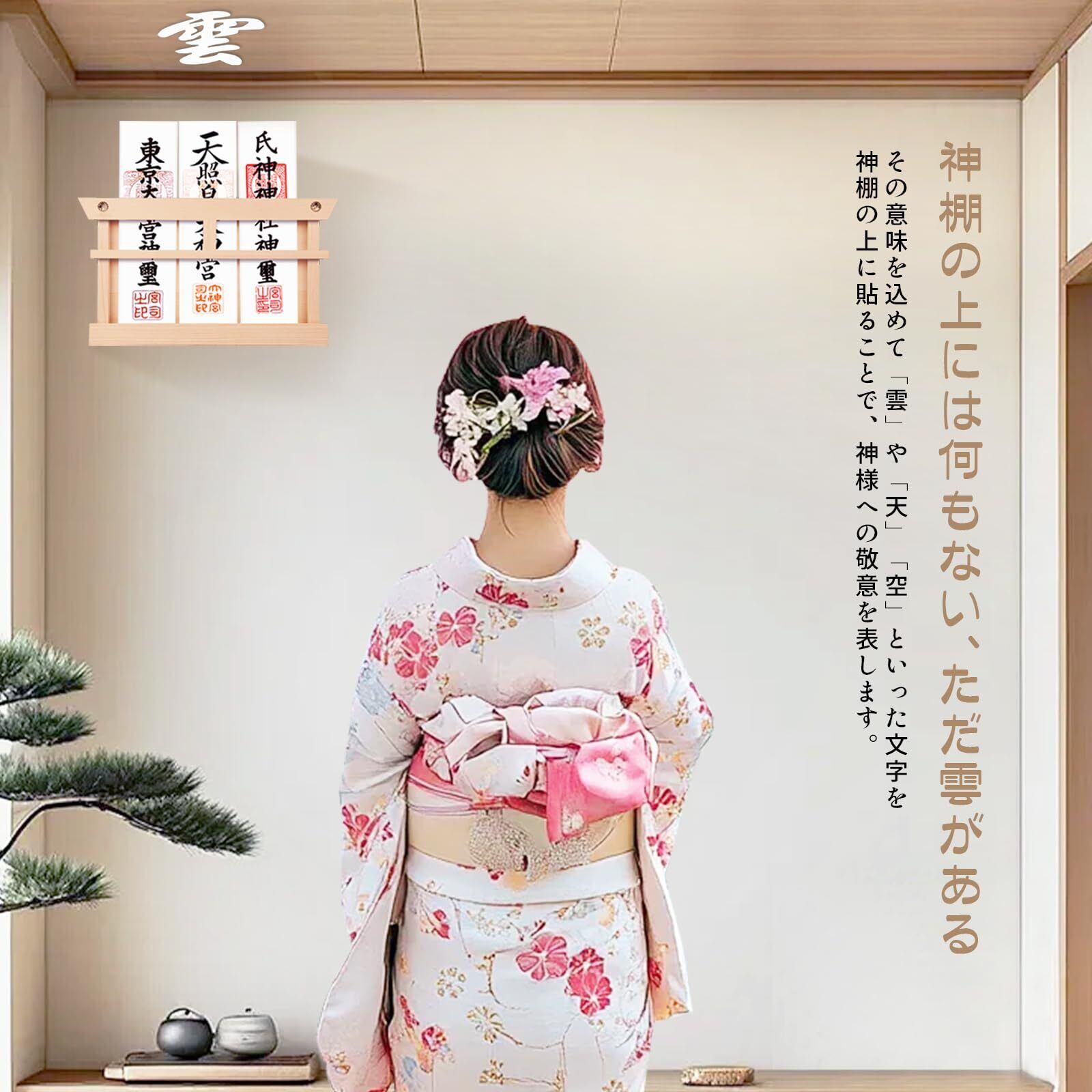 「神棚 雲の由来」神棚は神様をお祀りするための神聖な場所であり、頭上に物があったり人が通ったりすると、神様に対して失礼にあたると考えられています。特に上の階に住人がいるマンションでは、神棚の上を人が通る可能性があります。そうした場合には、神棚の上に「雲」や「天」、「空」といった札を貼ることで、神様への敬意を示すとされています。