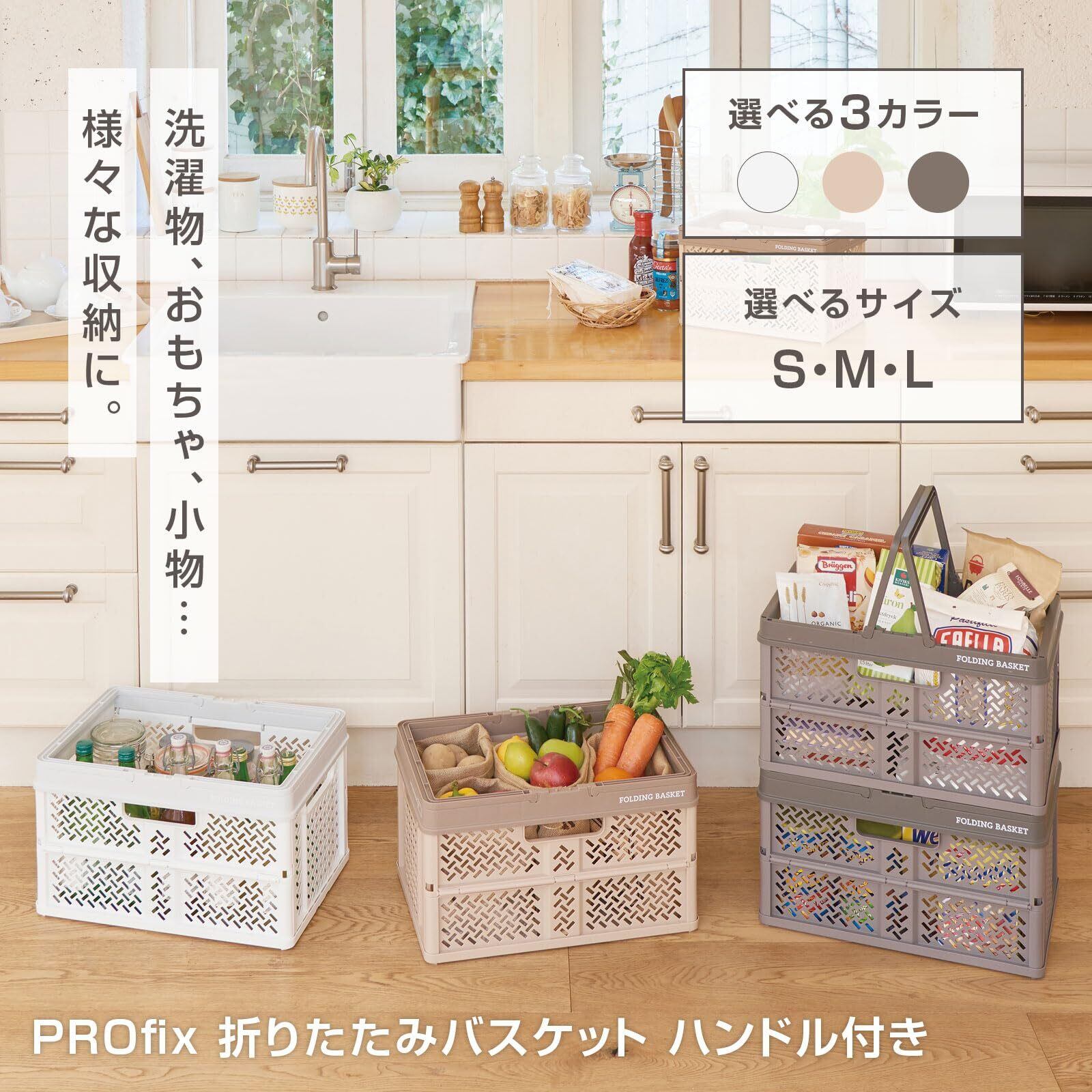 ●ハンドル付きで持ち運びやすいバスケット!使わない時は折りたたんで省スペースにしまうことができます。 ●Lサイズの上に2個並べて重ねられるサイズです。 ●取っ手と中央部の持ち手もあるので、どこからでも持ち運びラクラク! ●車、キッチン、キッズ収納、ランドリー、様々な場所で活躍します。