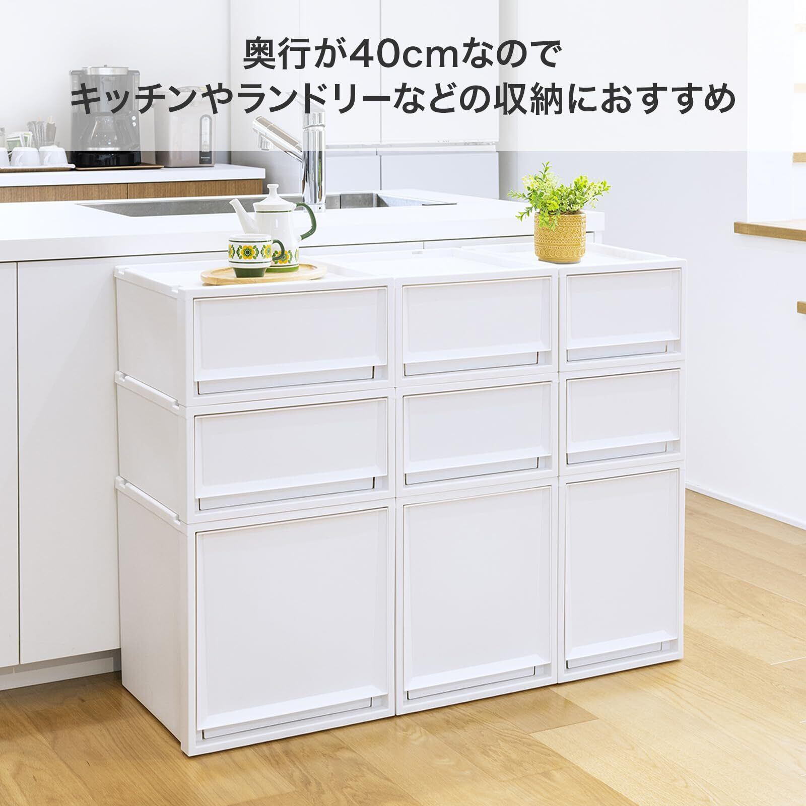 天馬の「フィッツケースFC40」がリフレッシュ!の爽やかなホワイトカラー!TSPP対応商品で再生ポリプロピレンを使用しています。”収納場所”ではなく、”収納する物”から設計したサイズ設計で、キッチンやランドリールームなどの省スペースにも最適な奥行40cmの収納ケース。シンプルなデザインなのでどんなテイストお部屋にも合いやすく、インテリア性を重視いたしました。天板のたわみを防ぐために前枠にアルミ補強板を内蔵し、頑丈に補強することで、より長くご愛用いただけるようにいたしました。ポイント、使いやすさは「FC40」をそのまま継承。別売の『差込式キャスター40』が取り付けられます。