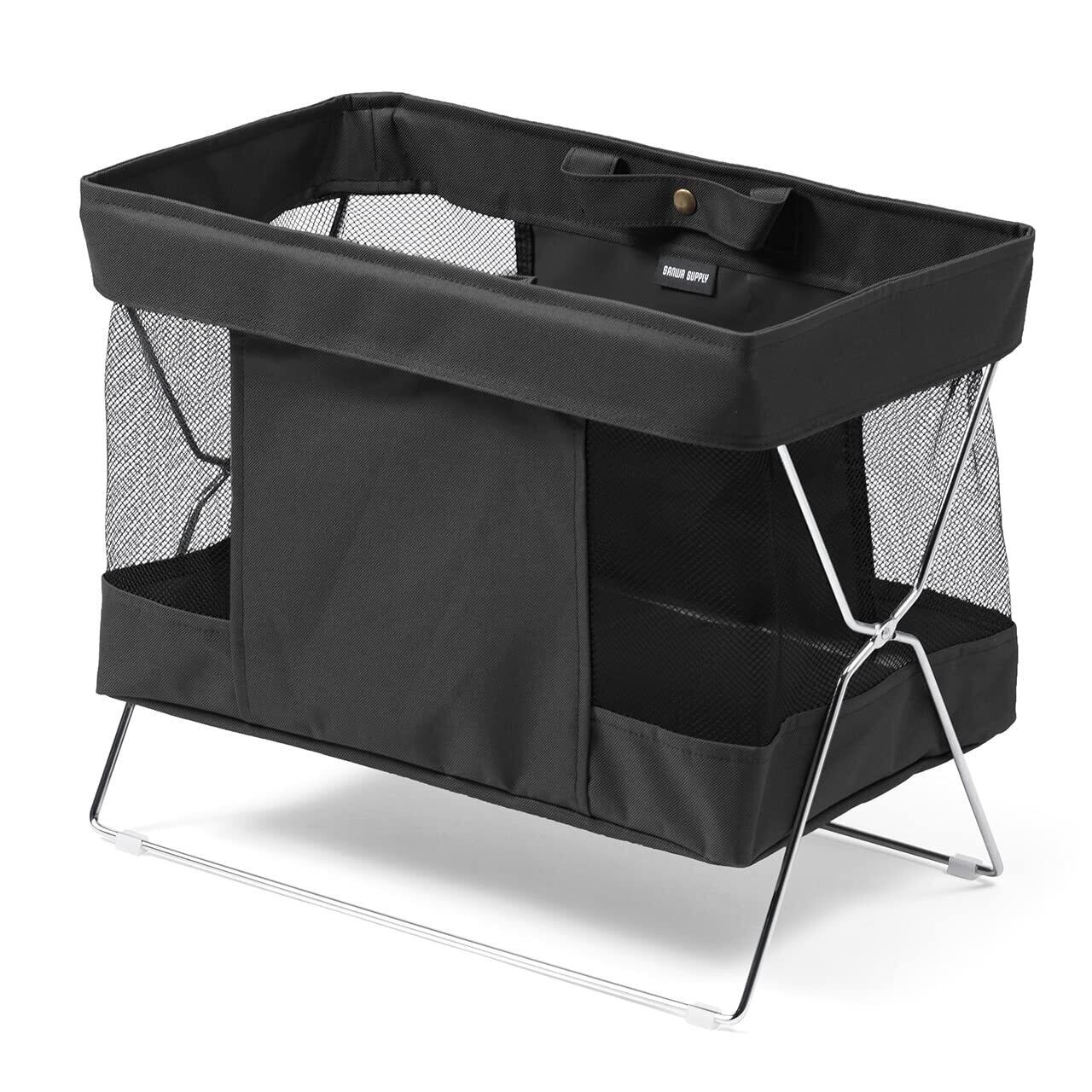 バスケット部とフレームは分離でき、取っ手付きなので持ち運びも可能です。取っ手はボタンでとめることができます。