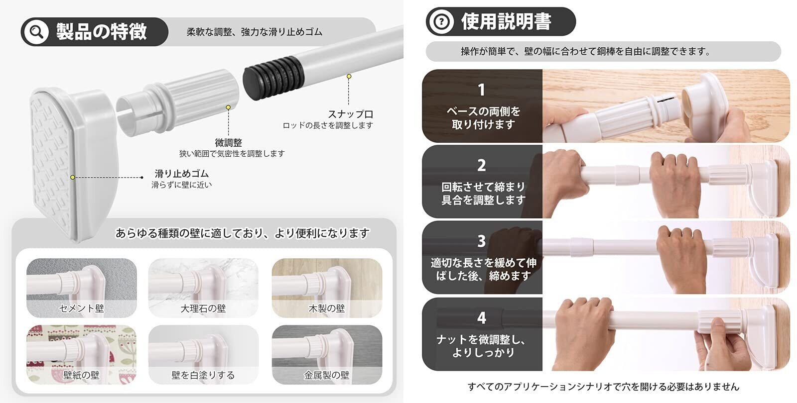 【簡単な取り付け】圧着板の壁に接する部分はゴムっぽい素材になっており、壁にぴったりします, 両サイドにダイヤモンド格子の凸凹がデザインされた摩擦力の高いシリコーンヘッドが採用され、2段式伸縮パイプを任意の長さに調節し回してロック、片側の回転式グリップを回すことで突っ張り固定できる仕様です。 くぎ ネジ パンチ等の工具を使わず、微調整ナットだけで簡単に取り付けられます。壁に穴がある心配もなく、壁に痕跡も残さないので、つっぱり棒を安心に取り付けて、