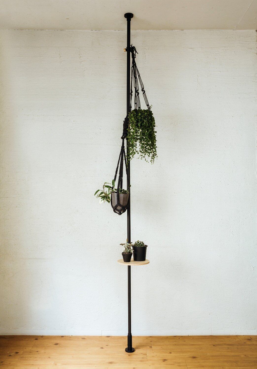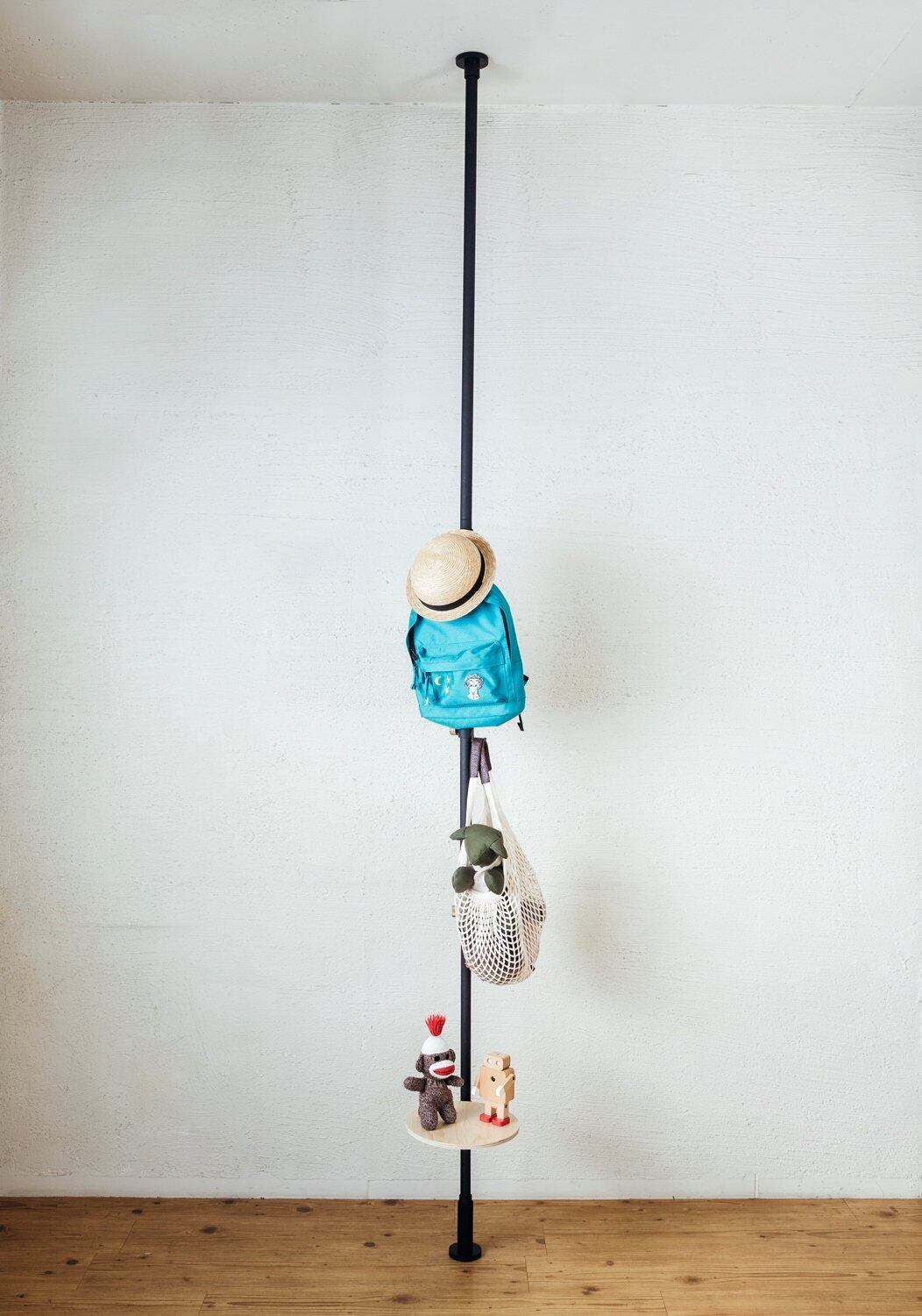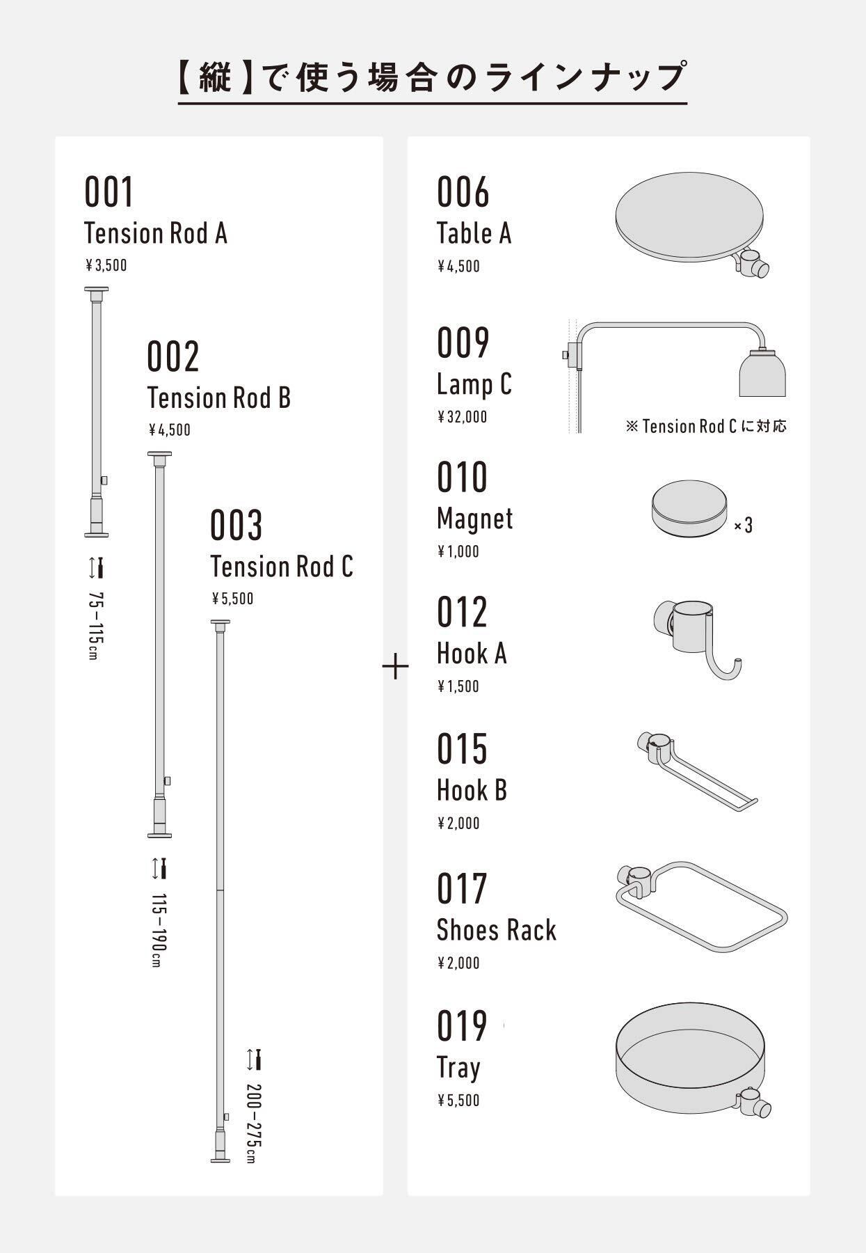 縦専用の収納をカスタマイズするベースとなるポールです。床と天井の間に突っ張って取り付けるので、壁を傷つけずフレキシブルに設置できます。テーブル、フック、トレイなどの縦用アクセサリーと組み合わせて、お好みの使い方、ディスプレイを楽しめます。
