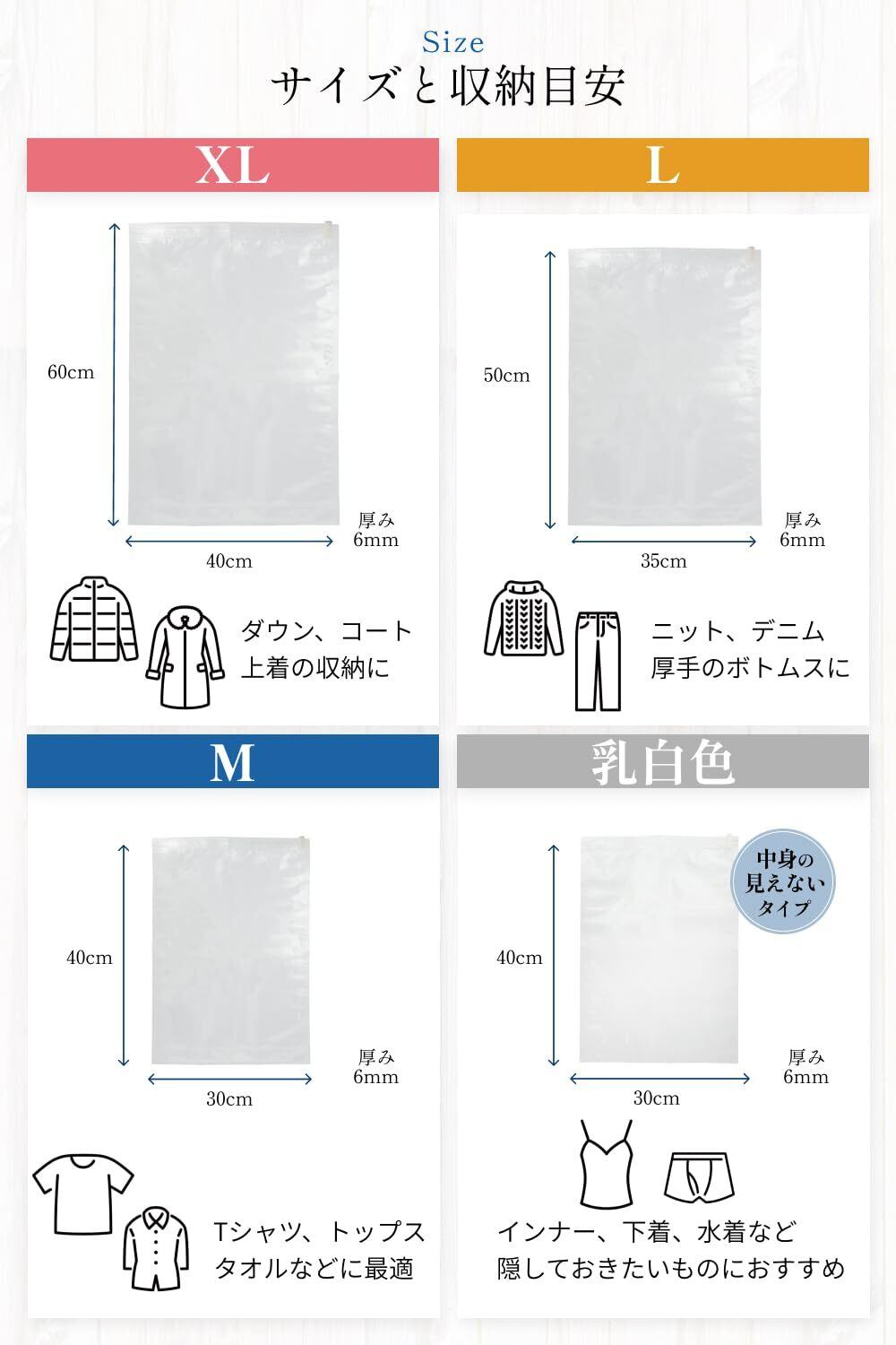 【用途に応じてサイズをお選びください!豊富な3サイズ展開】3サイズ展開しております。Mサイズは薄手のTシャツを2枚・Lサイズは厚手のセーターやズボンを1~2枚・XLサイズはダウンやコートなどを入れるのに適しています。