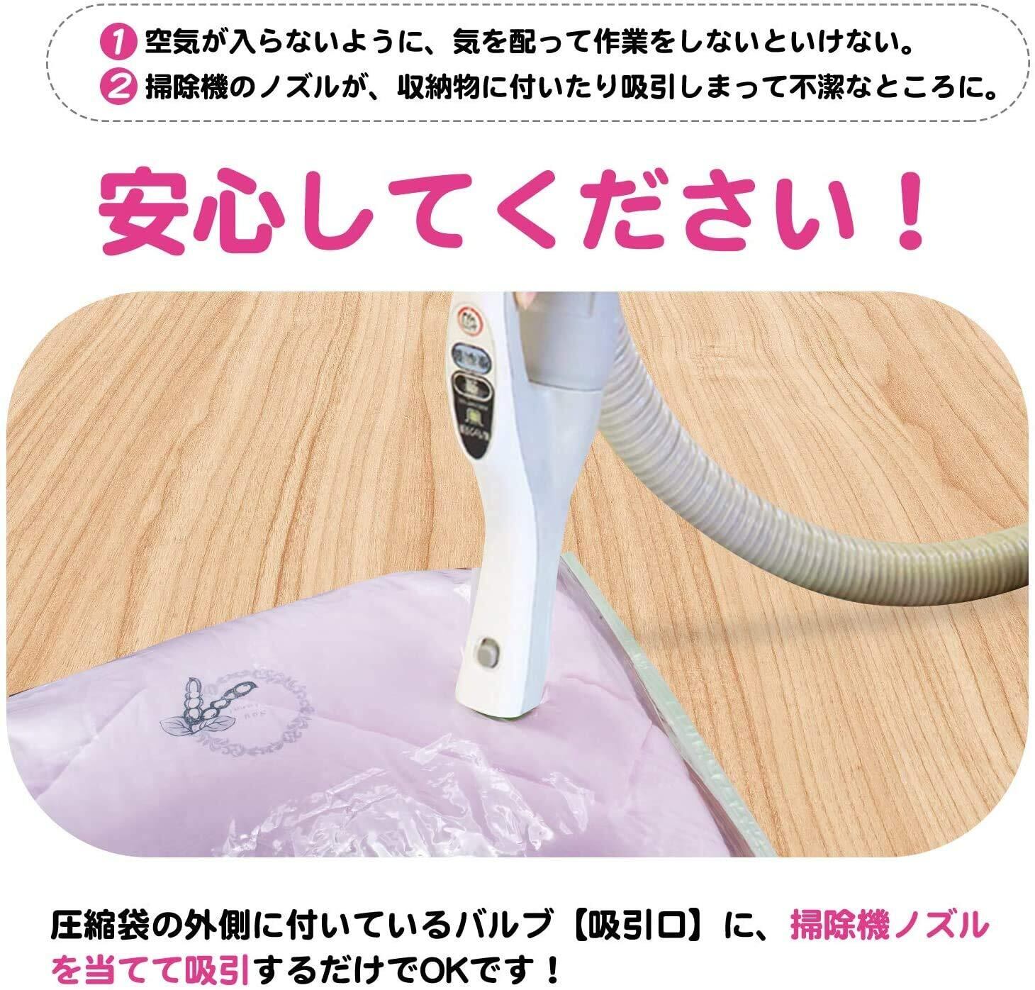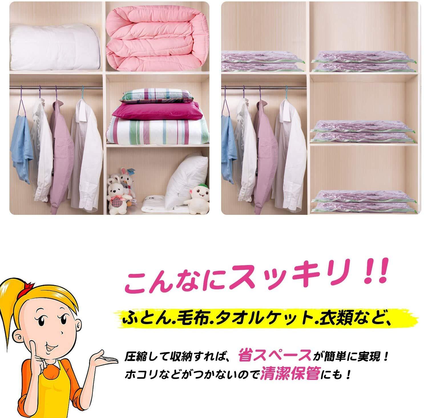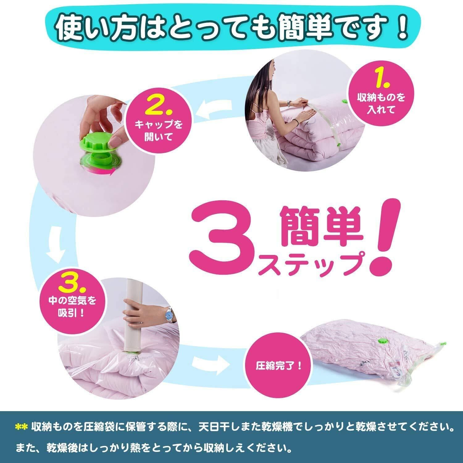 【品質】空気漏れなどの品質につきまして、何か問題がございましたら、ご遠慮なくお問い合わせください。ご注意:(1)羽毛布団と皮革製品に使用しないでください。(2)収納目安は約6ヶ月間です。半年を越えると圧縮率が低下して元に戻る場合があるので、1度取り出して天日干しするか、乾燥機で乾燥させてからもう一度圧縮してください。