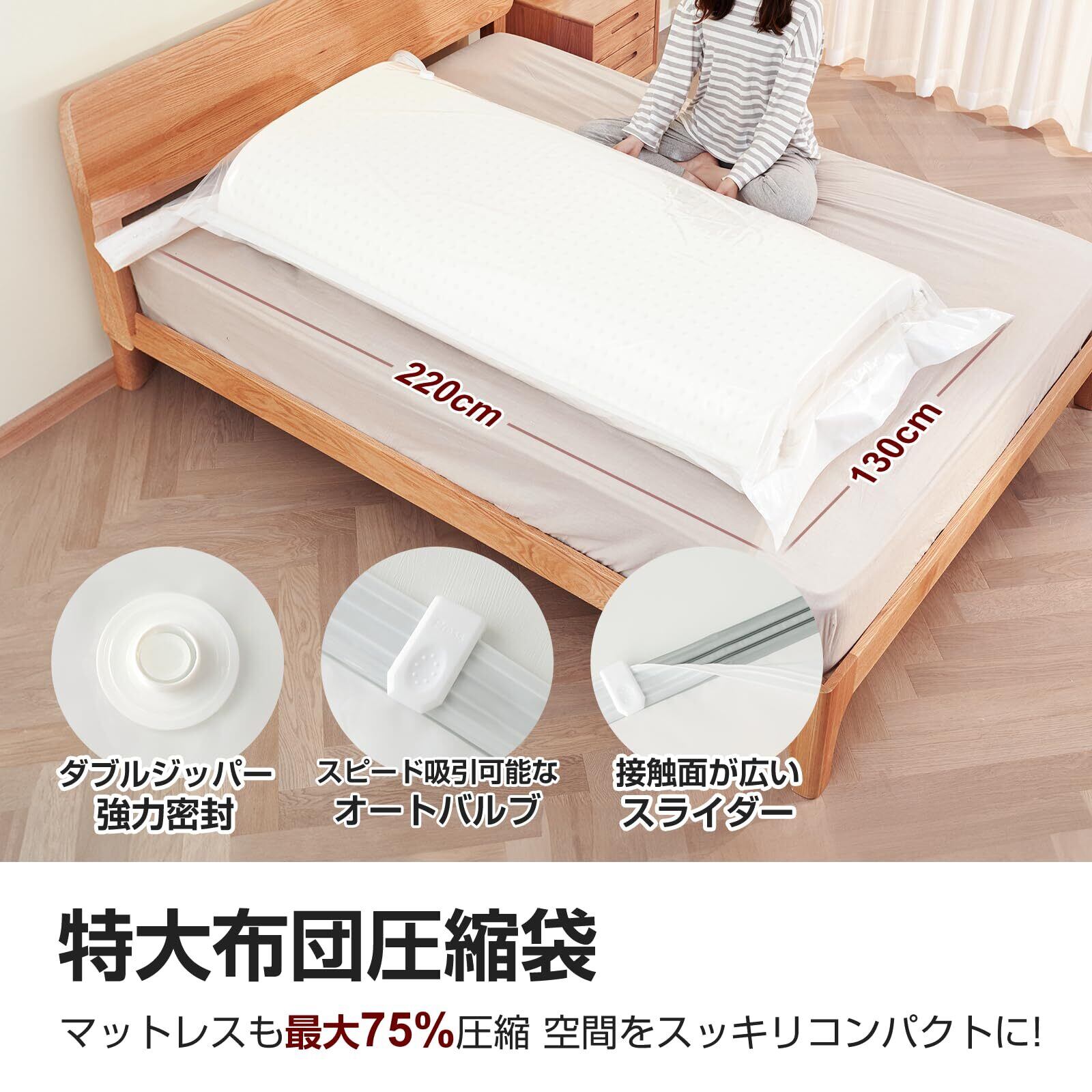 【PA+PE材質】サイズ:L:220×130cm。布団圧縮袋は耐久性に優れたPA+PEの材質が採用されておりますので、柔らかく壊れにくくなり、長時間保管でき、繰り返して使用することができます。季節変わり目、布団とマットレスの入れ替え時などには大活躍しています。