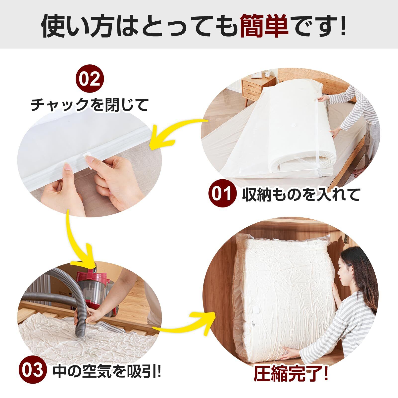 【操作が簡単】 専門的な設備は必要なく、電動ポンプ、手動ポンプや家庭用掃除機で簡単に圧縮工程可能で、手間を欠かず使いやすい圧縮袋です。(※空気弁の直径は約2.5cmです。ご購入前に、家庭用掃除機のインターフェイスが適合するかどうかご確認ください。)