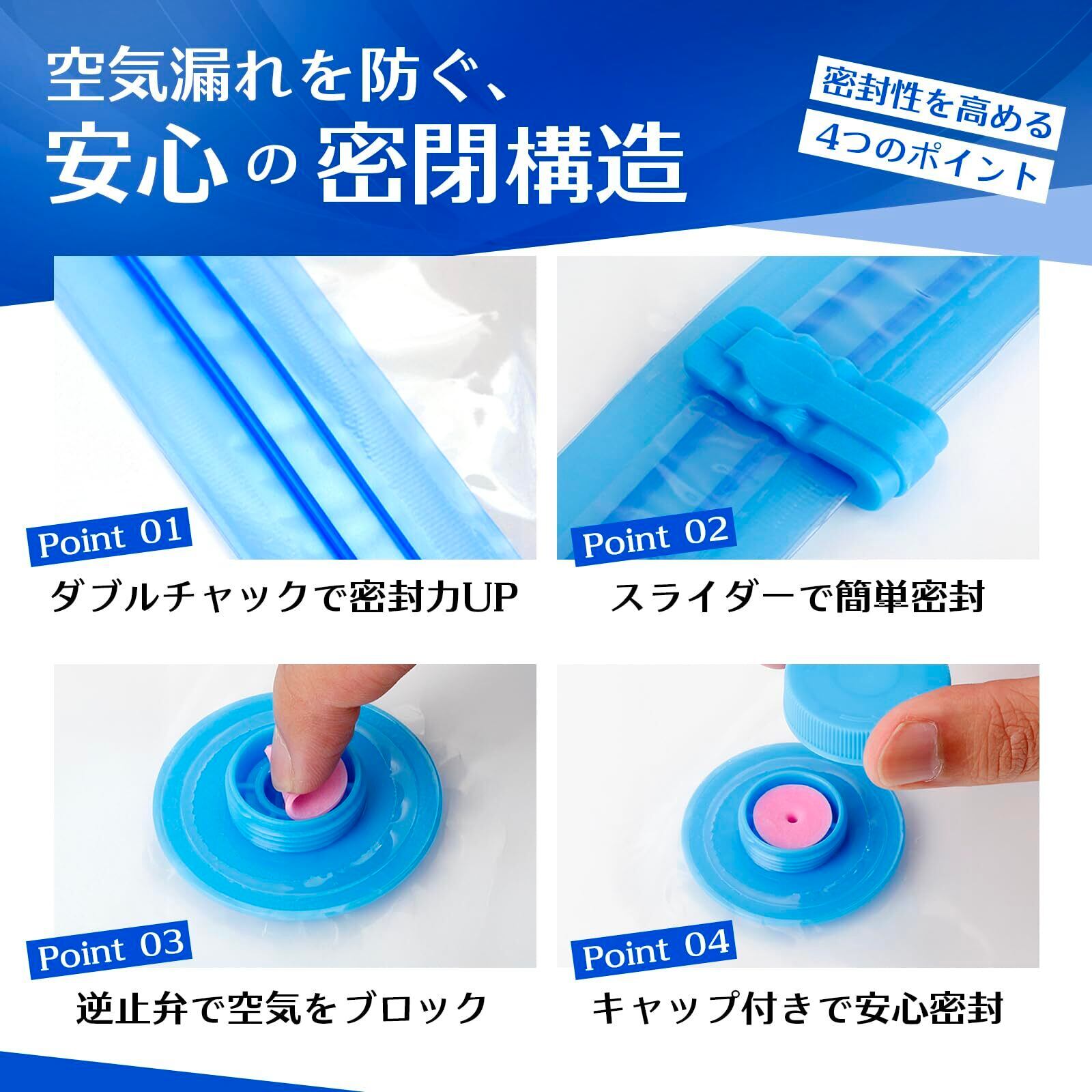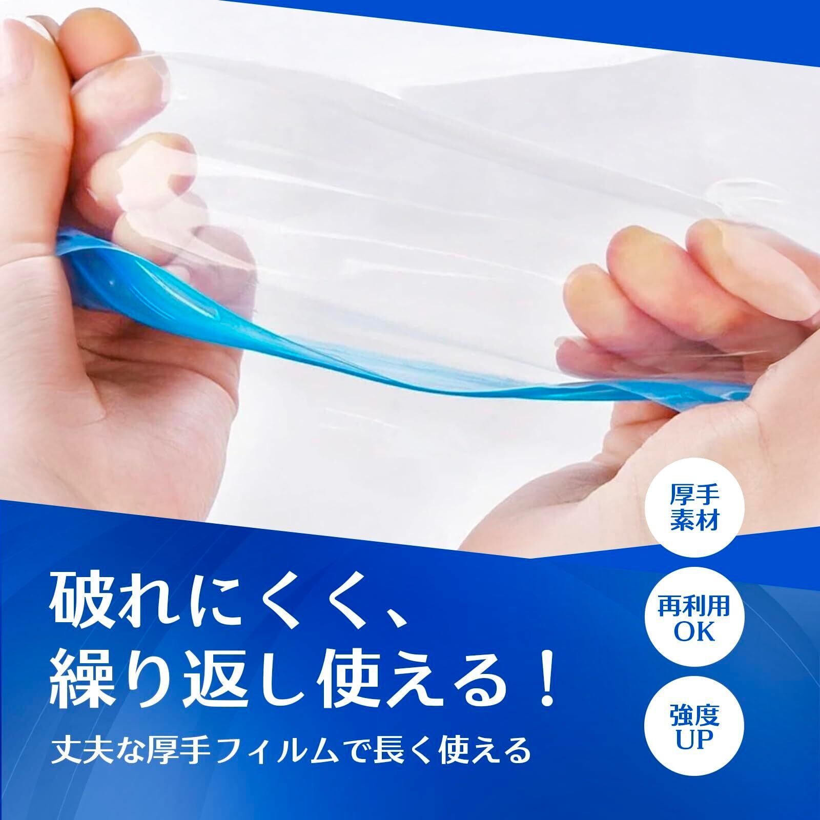 ②【業界標準を超える高耐久設計 ― 7ミクロンの厚みで破れにくい】 高品質なPA/PE素材を採用し、厚さは業界標準より約40%厚い7ミクロン。引っ張りや繰り返しの使用にも強く、空気漏れを防ぎながら長期使用にも安心の耐久性を実現しました。