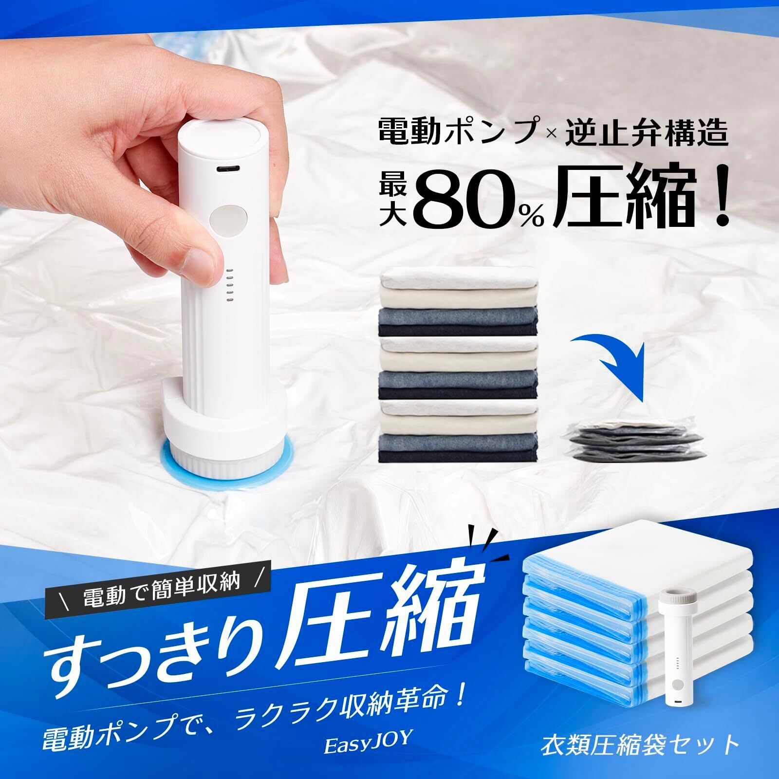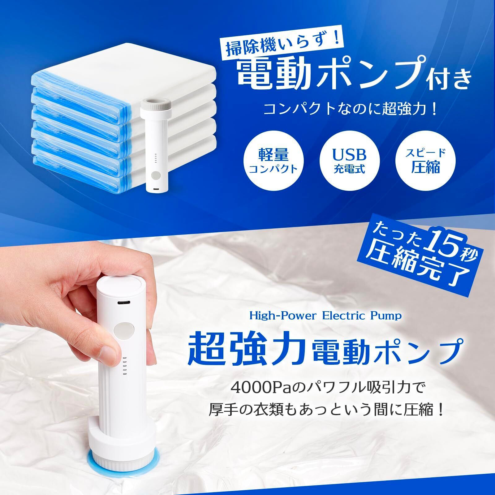 ①【掃除機不要!最大4000Paの強力吸引で瞬間圧縮】 Yurionの電動ポンプは、最大4000Paのパワフルな吸引力を実現。掃除機なしでも布団や衣類を瞬時にしっかり圧縮し、収納スペースを大幅に節約。旅行・出張・引っ越しなど、あらゆるシーンでスマートに荷物を整理できます。
