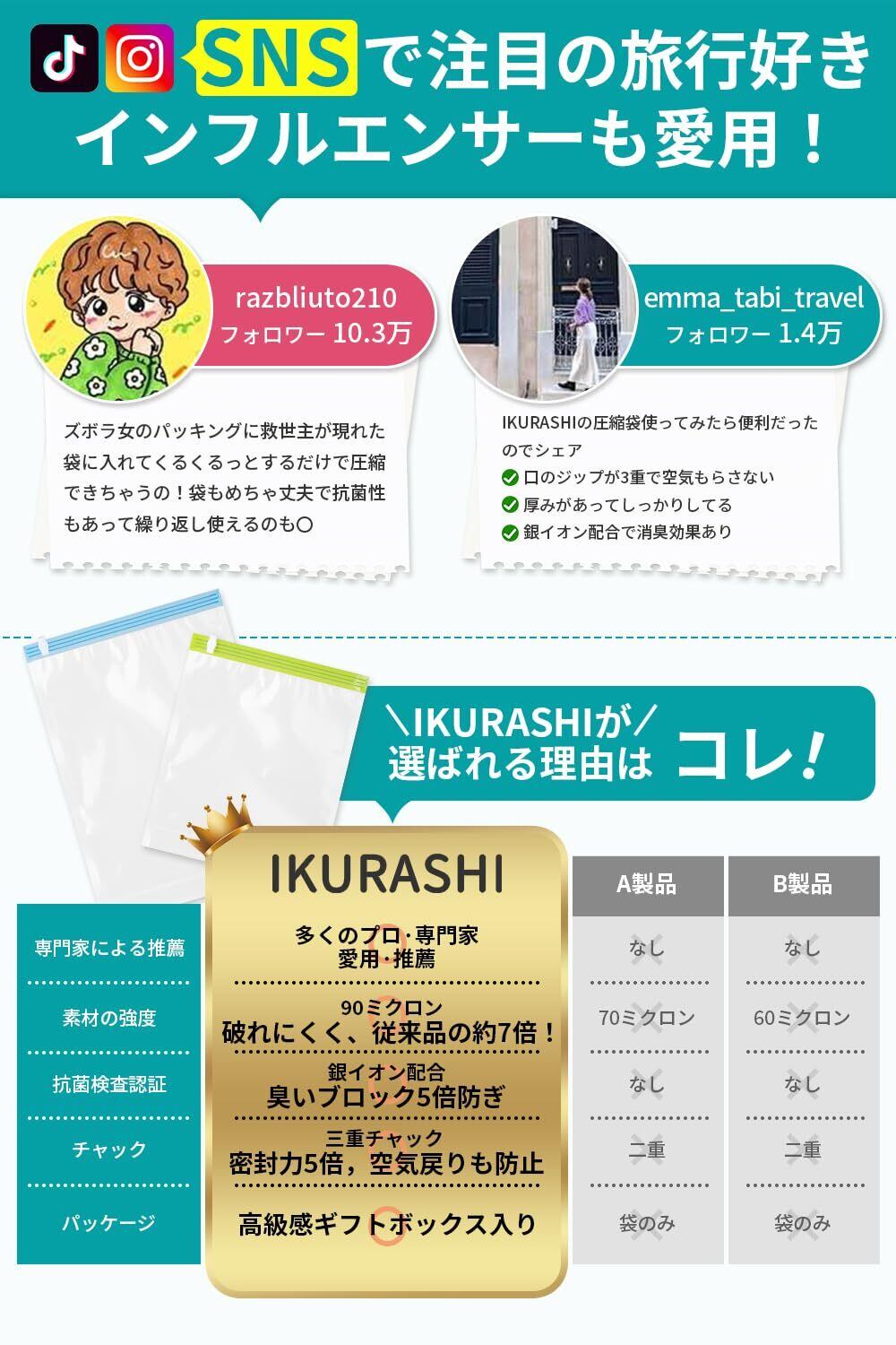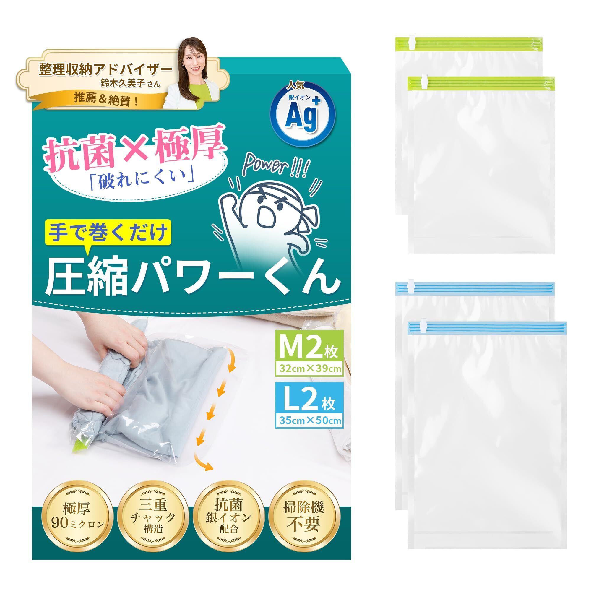 【防臭5倍・抗菌銀イオン搭載 × 強度7倍・極厚90ミクロン】 IKURASHI 圧縮袋 旅行 衣類圧縮袋 圧縮パワーくん 【3重チャック密封力UP】 手巻き式 現役整理収納アドバイザー監修 便利グッズ 大容量 防臭 繰り返し使える 出張 修学旅行 M2枚+L2枚