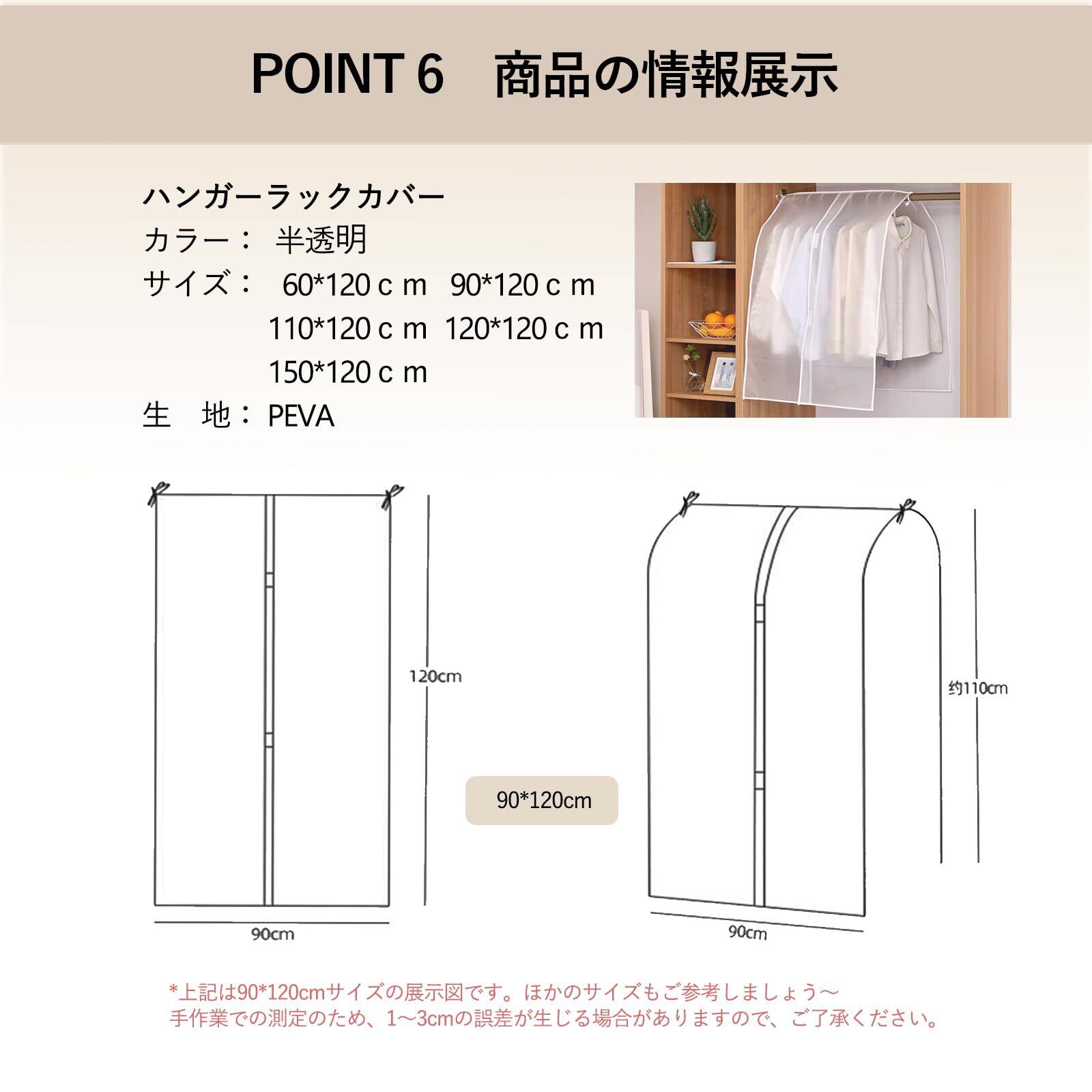 【耐久性バツグン】材質:PEVA 色:半透明。サイズ:90*120cm、110*120cm、150*120cm。使い勝手の良いハンガーラックカバー。内容:1枚セット。ビニール素材だから、ちょっと雑に扱っても破れにくくて、ガシガシ使っても大丈夫!防塵・防水機能があり、耐久性が高く、繰り返し使用可能。長持ちするから安心だよ〜猫を飼っているお家でも、毛の付着を減らし、爪にも負けない強さでいつでもクリーンに保てるよ。