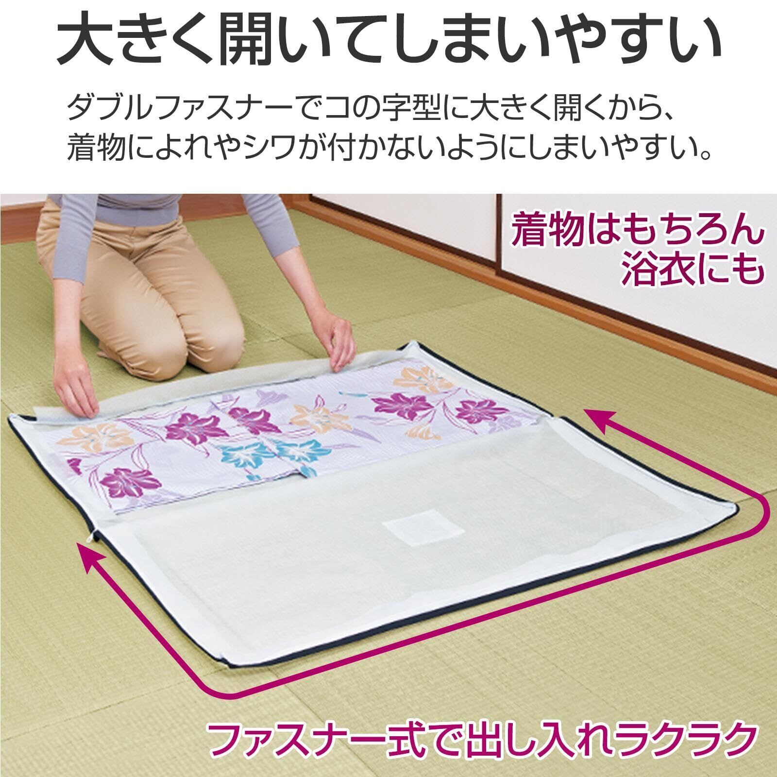3方向ファスナー式で大きく開いて出し入れしやすく、着物にしわやよれが付きにくい。