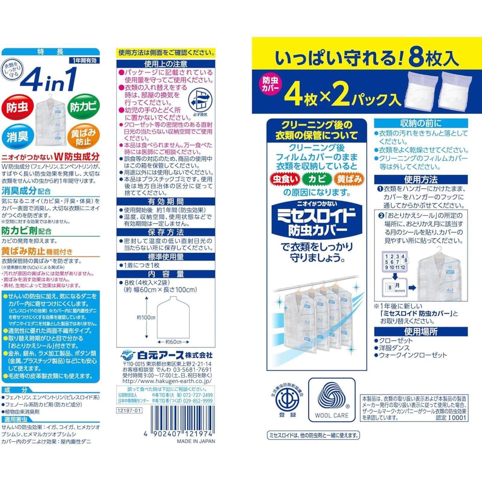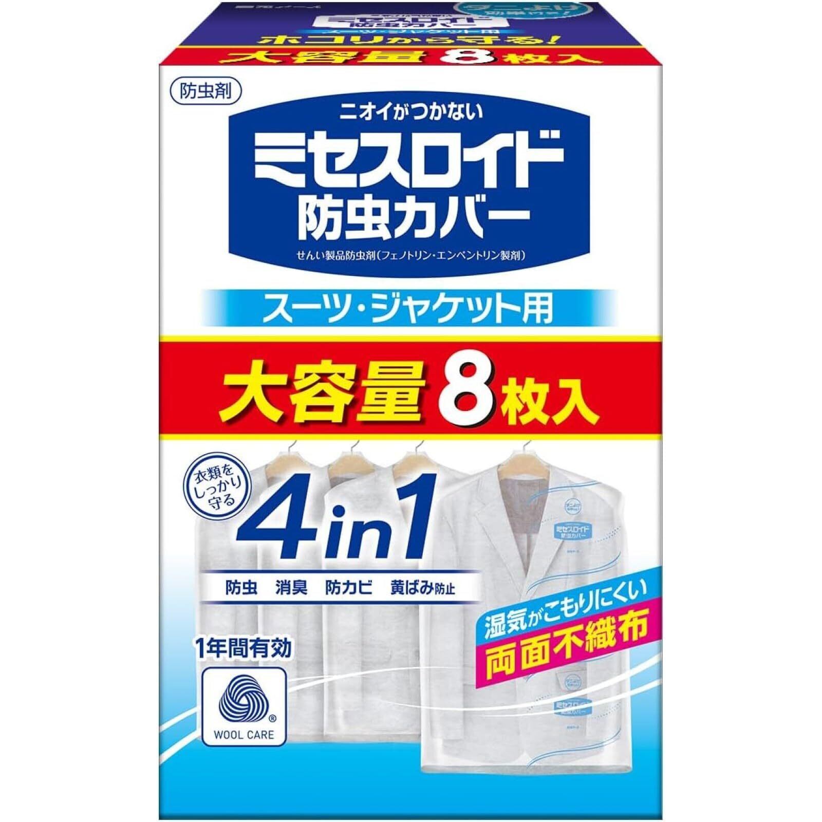 ミセスロイド 白元アース 防虫カバー スーツ・ジャケット用 8枚入 無香 無臭 1年間有効 衣類カバー 虫除け 防カビ 消臭 黄ばみ防止