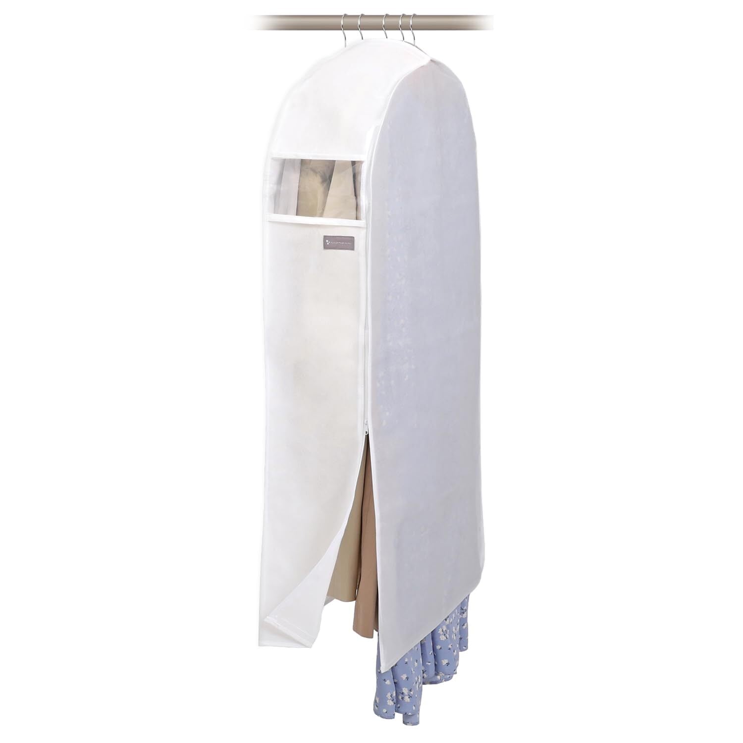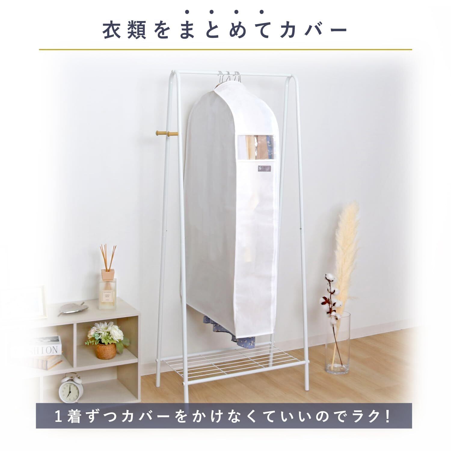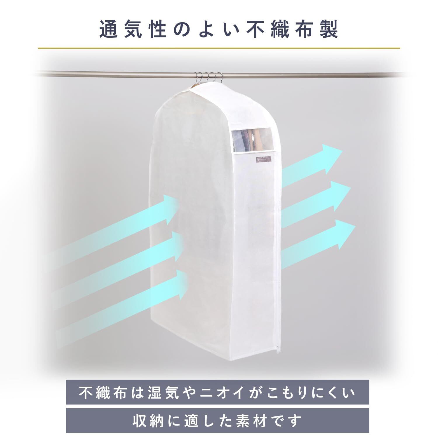【幅広マチ付き衣類カバー/下部開きでロング丈にも対応】:まとめてホコリ除けができる、通気性の良い不織布製の幅広マチ付き衣類カバー。下部が開いているので、ロングコートやワンピースなどの丈の長い洋服にも対応。