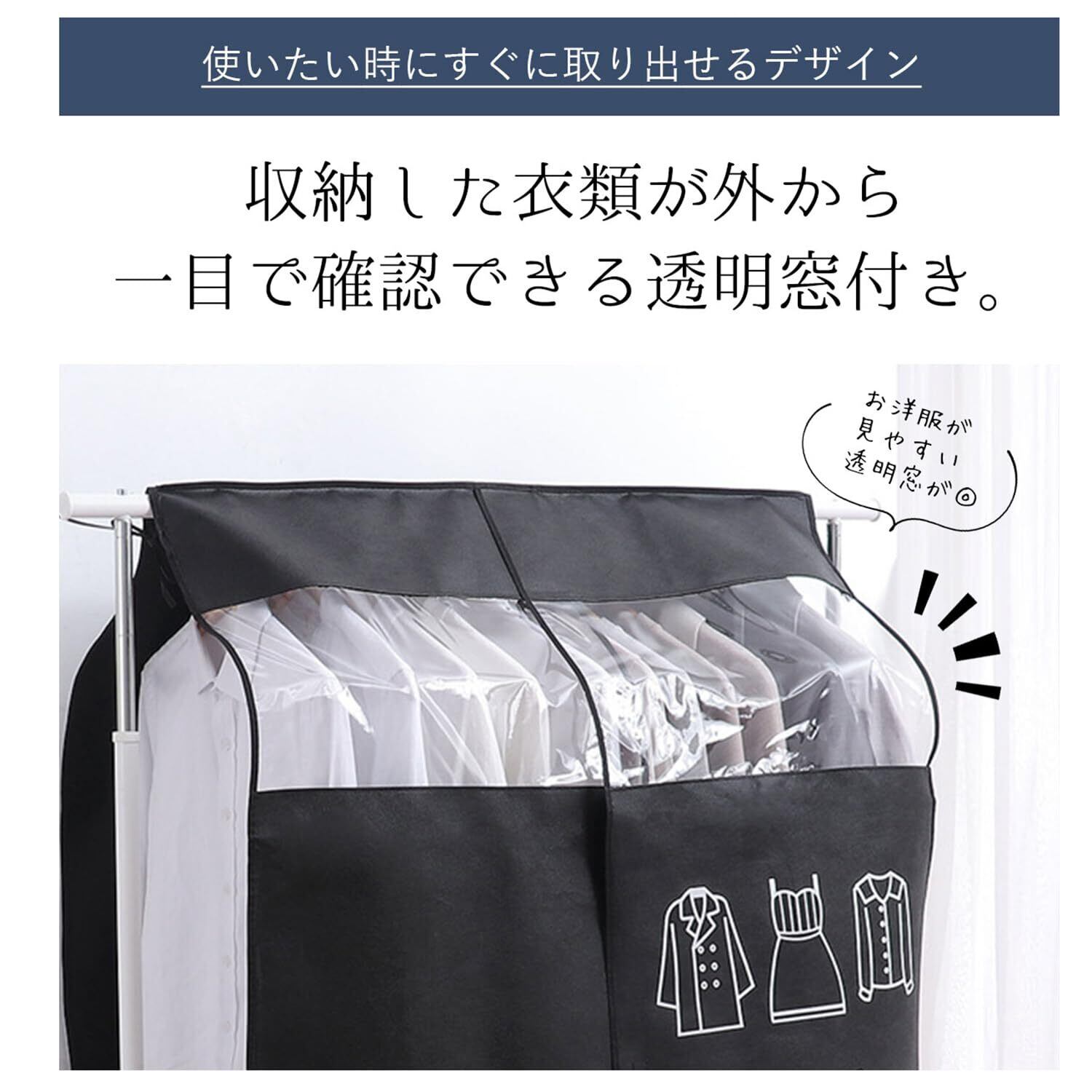 【使いたい時、すぐに取り出せるデザイン】収納した衣類が外から一目で確認できる透明窓付き。場所を移動せずに保管ができます。 取り出しやすいフロントスリット仕様で、簡単手間いらず!マジックテープが付いているので、カバーの広がりを抑えます。1枚1枚丁寧にカバーに掛ける必要もなく、まとめて収納できるのが嬉しい
