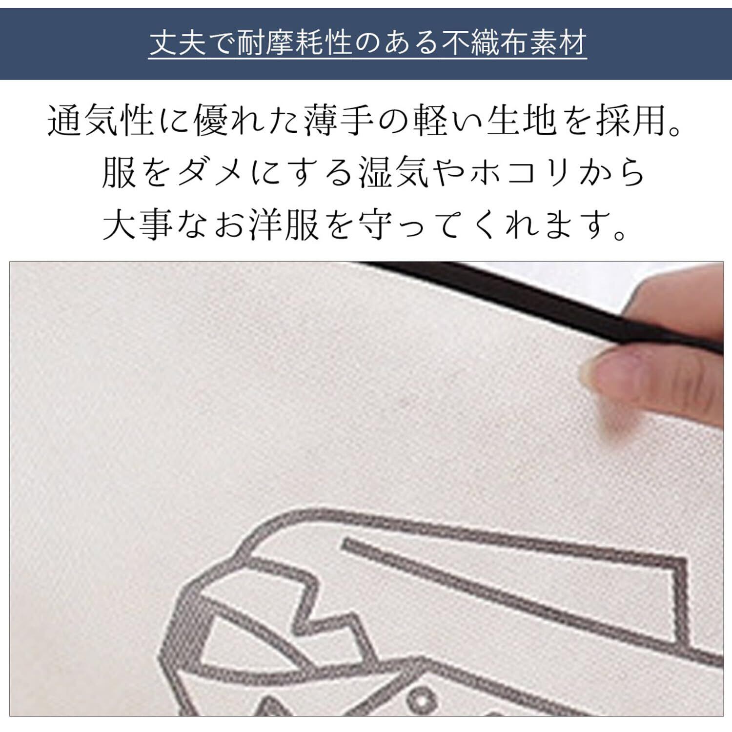 【丈夫で耐摩耗性のある不織布素材】通気性に優れた薄手の軽い生地を採用。大切な洋服をホコリや湿気から守り、しっかりとカバーしてくれます。