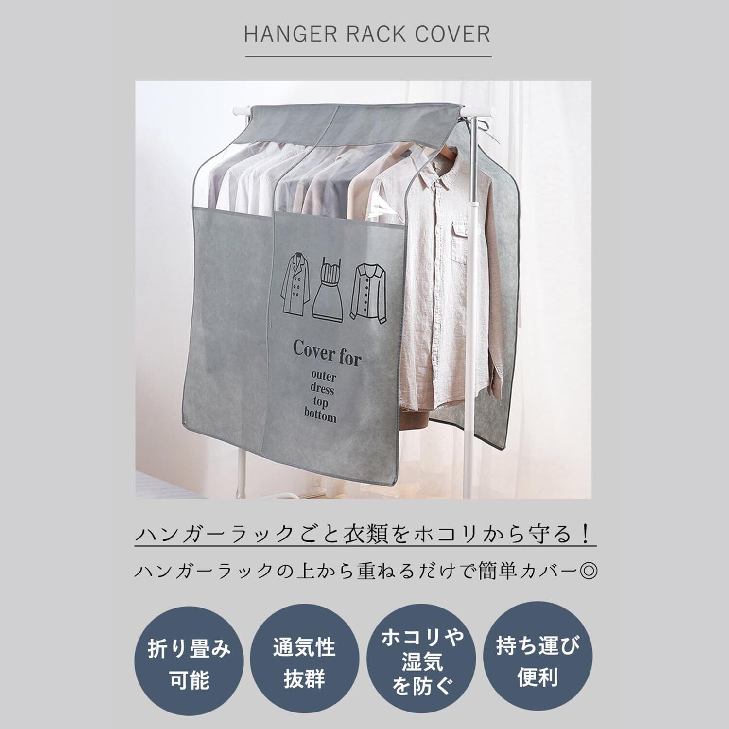 【ハンガーラックごと衣類をホコリから守る!】通気性の良い不織布が主素材で、透明窓からは中身が一目で確認できます。 見た目のごちゃごちゃ感が一掃できて、衣類の丈に合わせて仕分けできるので クローゼットがすっきり、スペースの有効利用が可能。 ホコリや汚れから衣類を守りたいけれど、1枚1枚カバーするのは面倒・・という方にはぴったり!!