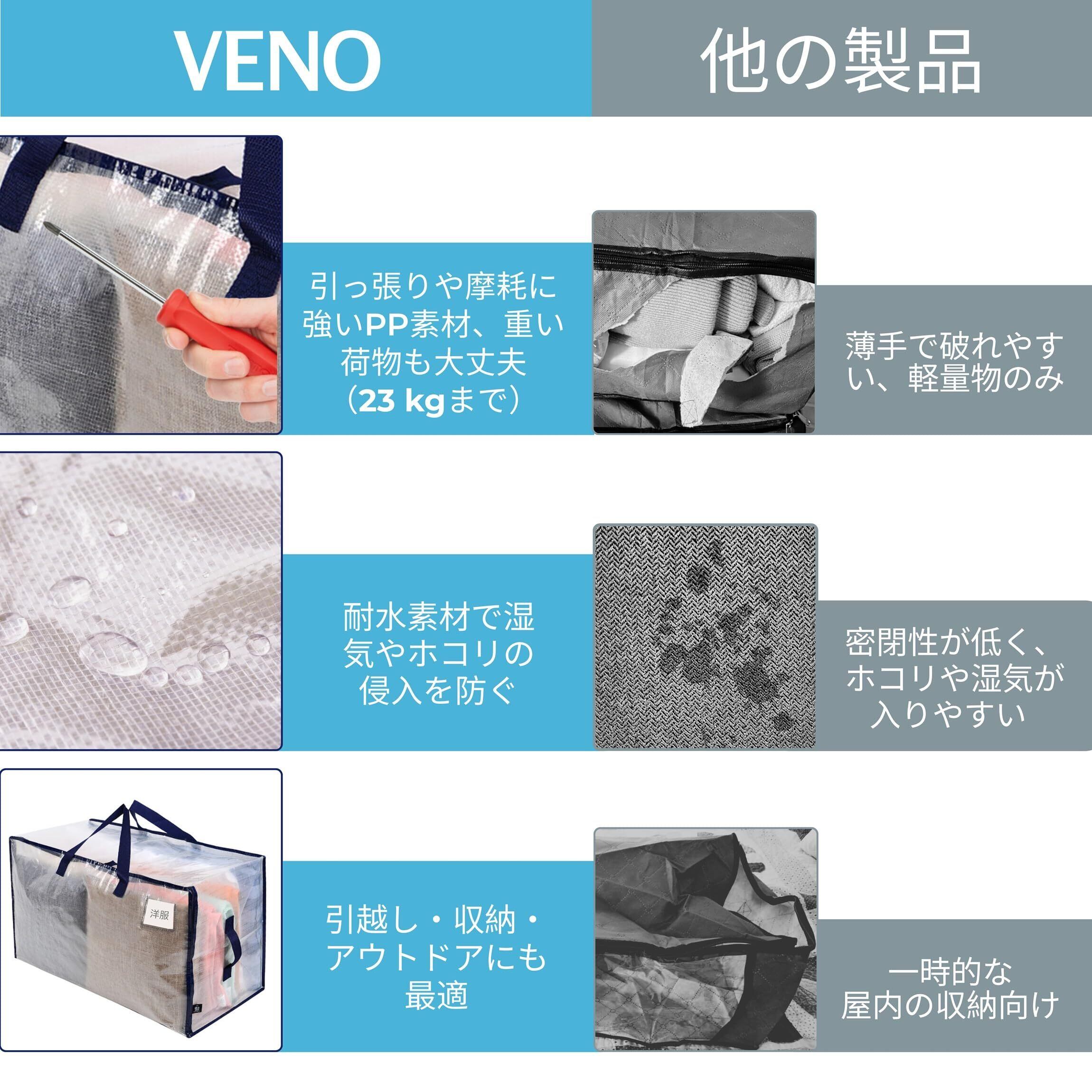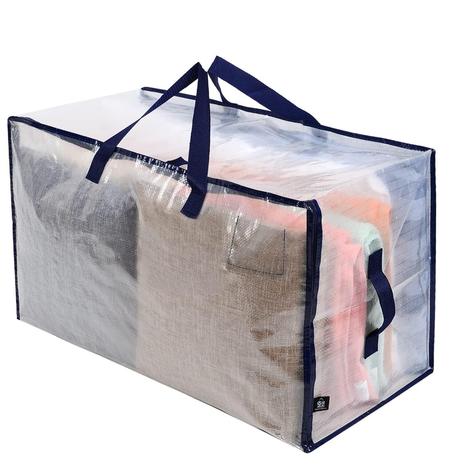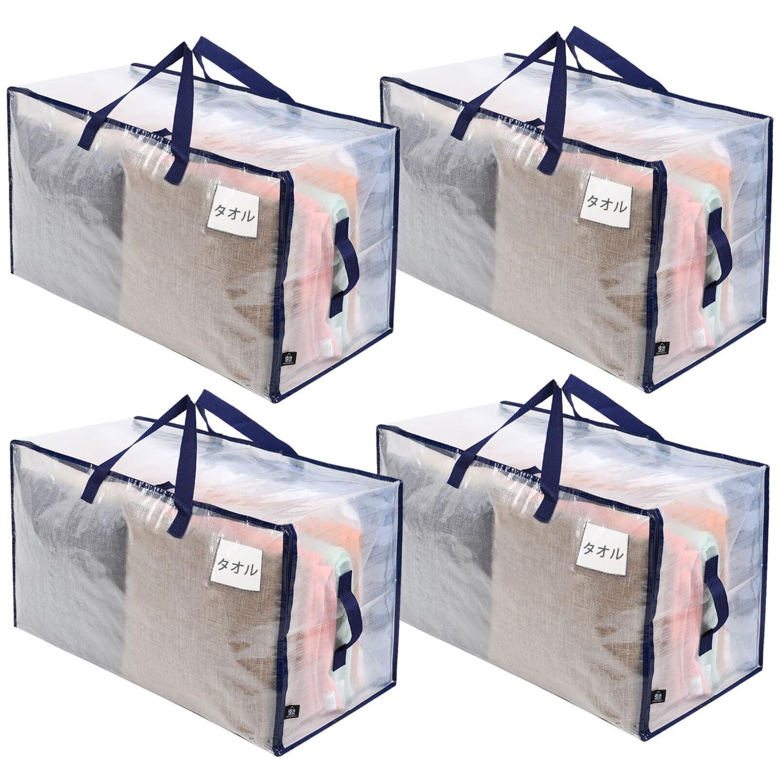 VENO 布団収納袋 103L大容量 引越し用ダンボール 代替品 布団袋 3面ファスナー 2ペア持ち手付き 耐水 高耐久 折りたたみ ラベルポケット付き 収納ケース 引越し 布団収納 衣類収納 押入れ収納 (半透明 4枚セット)