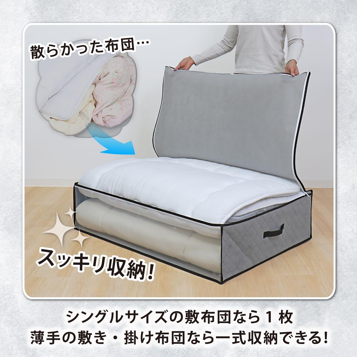 ●活性炭と珪藻土のダブルパワーで消臭保管。来客用などの敷き布団をニオイ・ホコリ・汚れからしっかり守る。