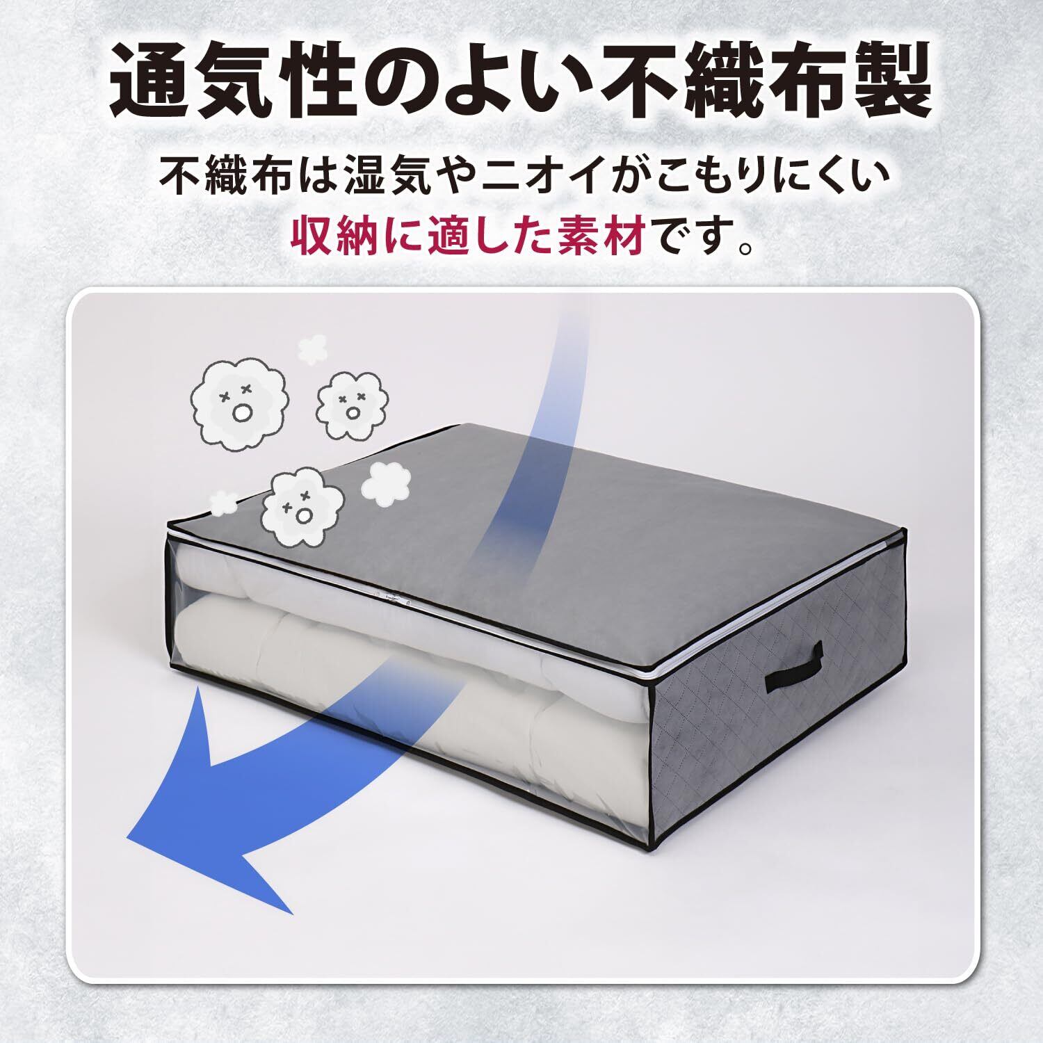 通気性が良くホコリを通しにくい生地のため、衣類や寝具の収納に適しています。