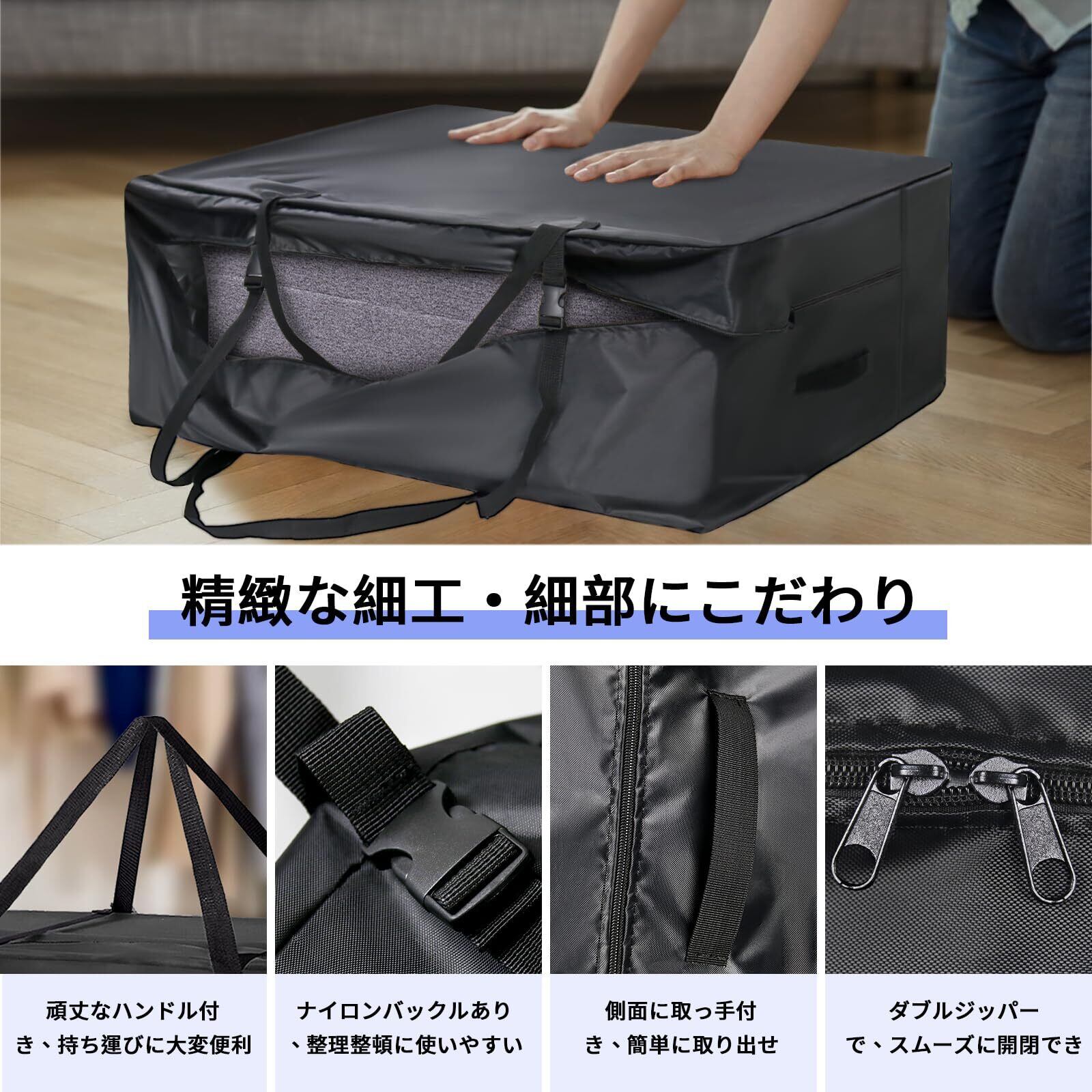 【頑丈・しっかりしている】高品質420Dオクスフォード布を採用しており、普通の不織布よりずっと頑丈で、磨耗性に優れて、長時間使用できる大型ふとん収納バッグです。防水性・防塵性を共有していて、お使いやすいいいグッズです。