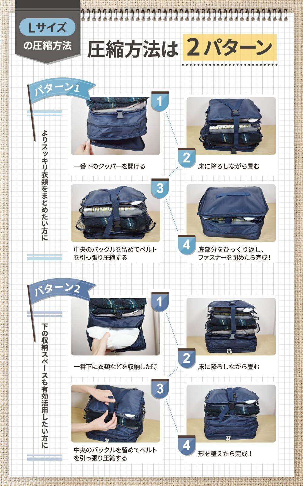 【吊り下げながら荷造り可能】 LIXIAのトラベルポーチは、ポーチを吊り下げたまま荷物の整理が可能です。旅行の準備が忙しい時にも、手元で荷物を圧縮し、すっきりとまとめられます。出発前のストレスを軽減し、スムーズに荷造りが進むことで、旅の楽しみを存分に味わえます。家族旅行や出張、短期の外出など、さまざまなシーンで活躍する便利アイテムです。