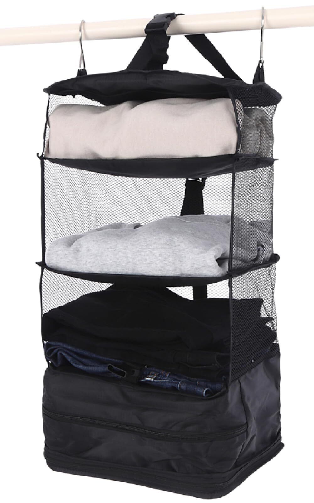 【掛け方2通り、圧縮方法2通り】 LIXIAのトラベルポーチはフックでの掛け方に加えて中央のベルトでも吊り下げることが可能に。従来のポールに掛けるという使い方だけでなく、洗面所のタオルラックやドアノブ、ハンガー掛けなど様々な場所が自分専用衣類収納棚に変身! 3点掛けもできるので荷物が安定し、耐荷重もUP。※最大耐重量 約10kg以内