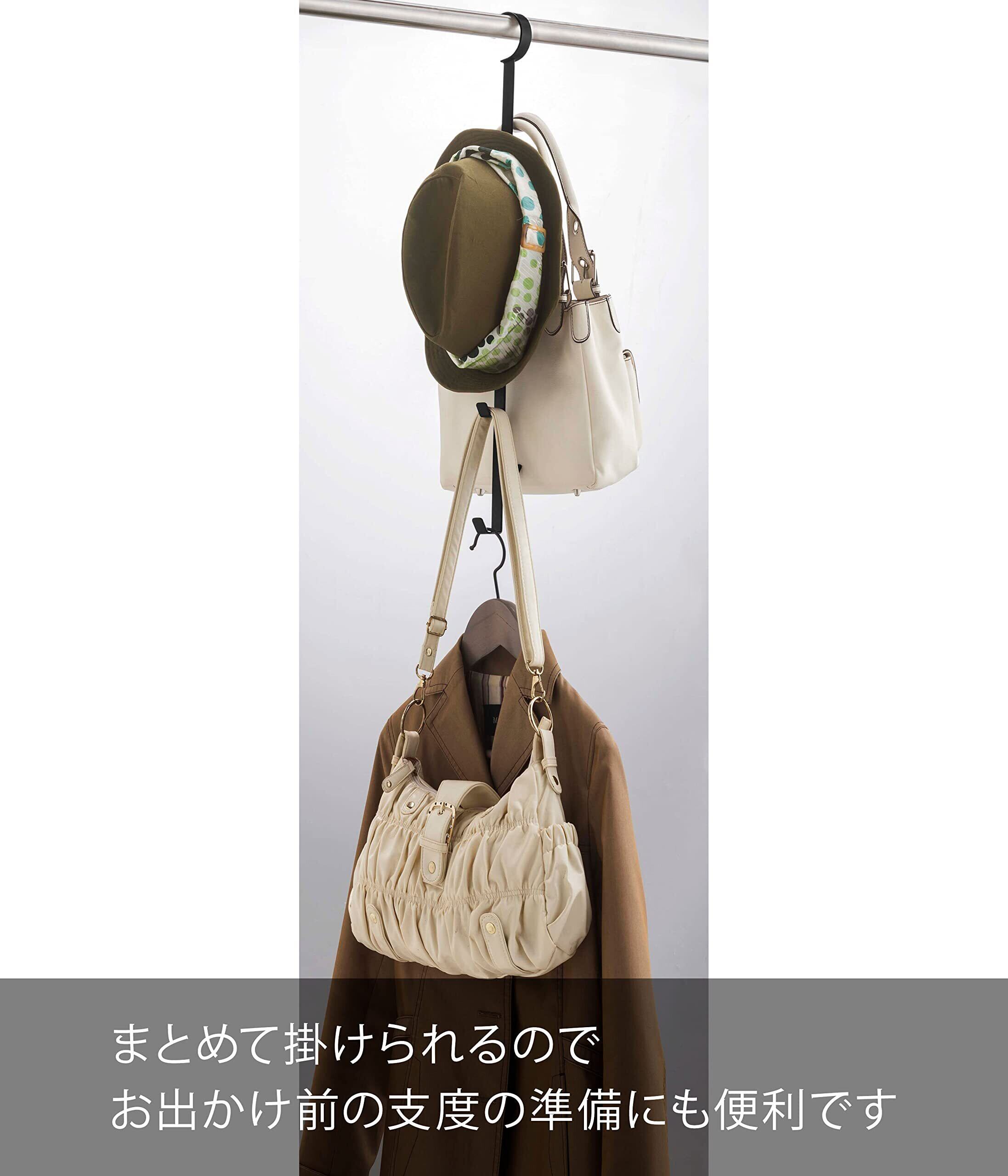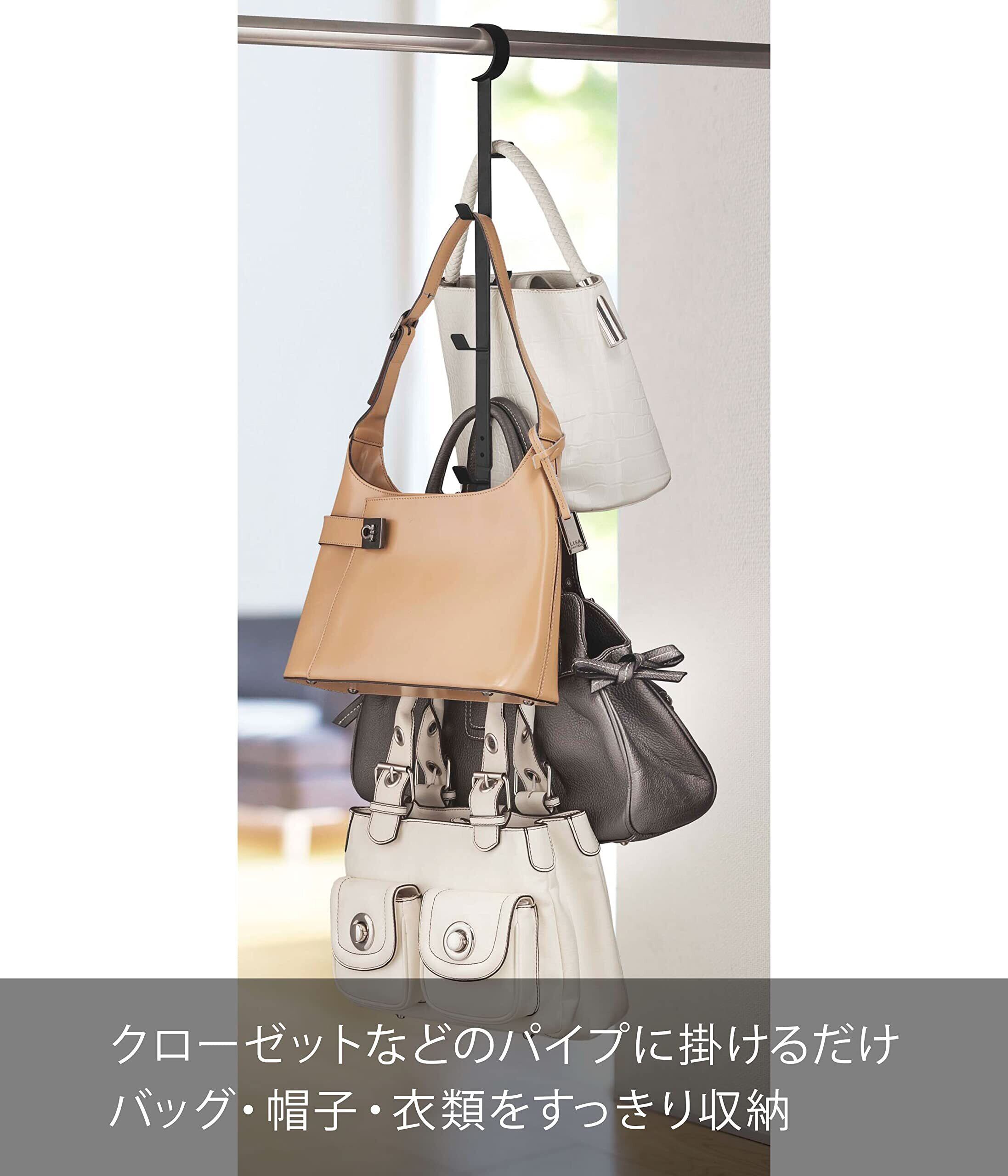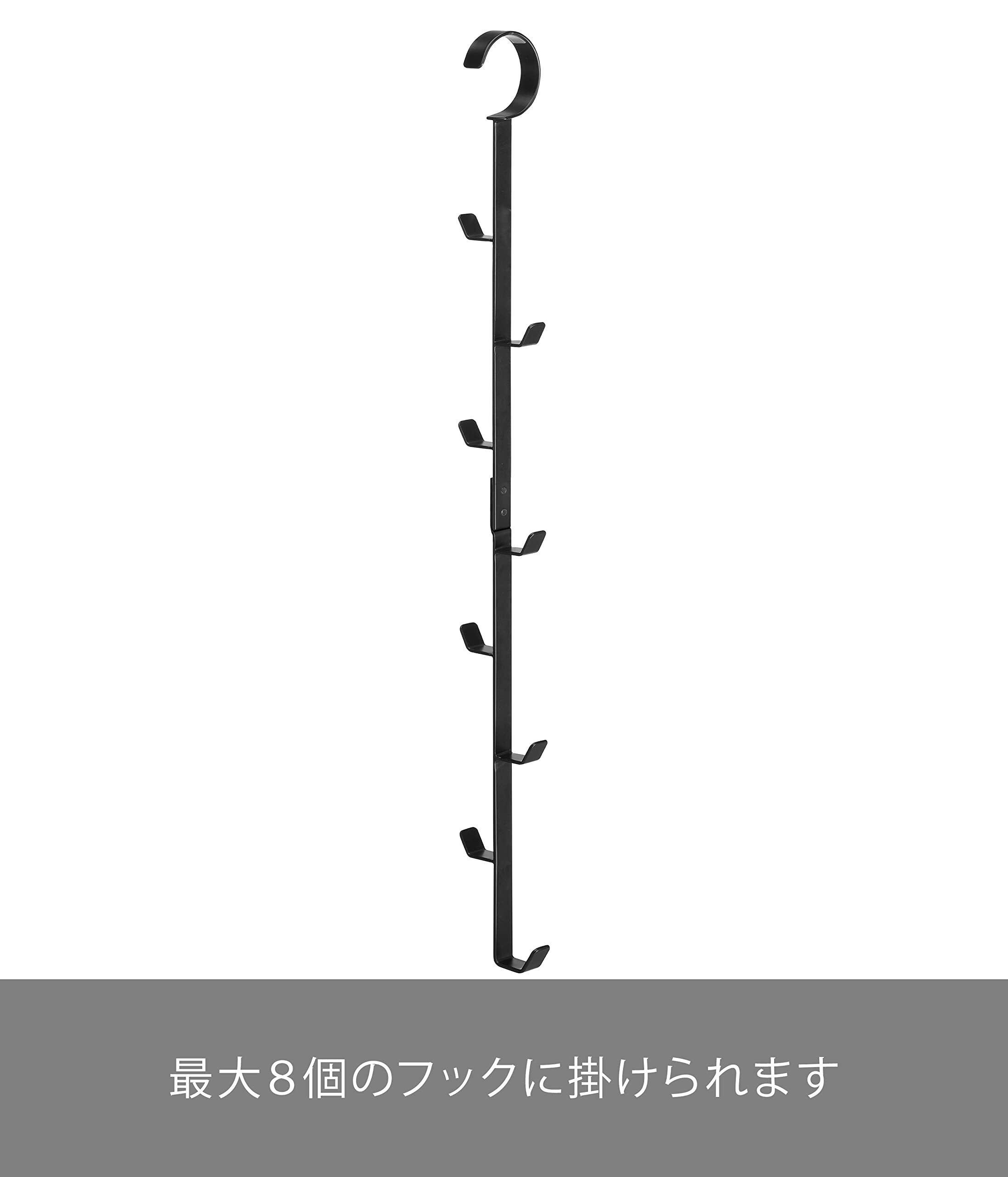 散らかりがちなバッグや帽子もクローゼットにまとめて収納。帽子・鞄・小物類をスリムに一括収納!クローゼットのパイプに掛けるだけの簡単設置です。縦に複数かけられるスリムタイプ。クローゼットにも馴染むスマートなデザインです。 ■サイズ:幅6×奥行5×高さ54cm■材質:本体/スチール(粉体塗装)■重量:230g■原産国:Made in China■備考:耐荷重/フック1つにつき約1kg
