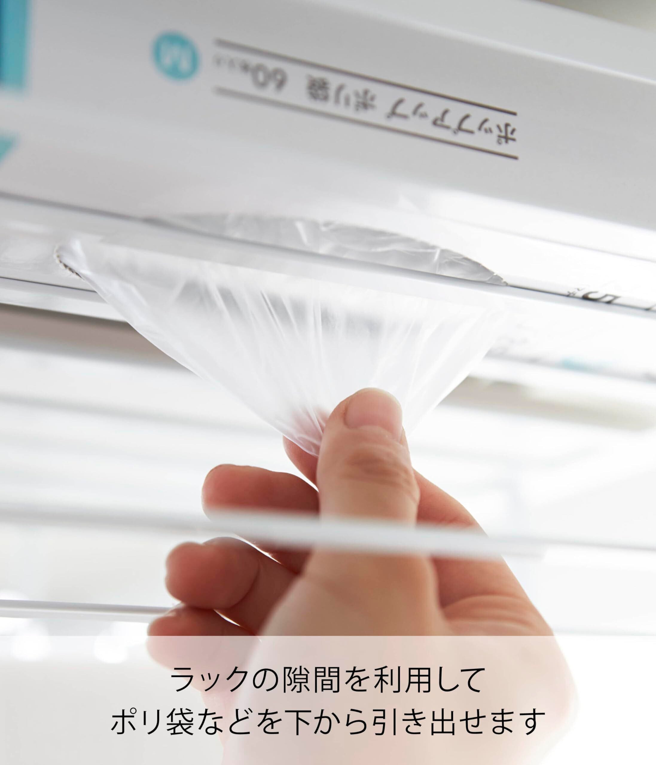 ラック下の隙間を利用してポリ袋やティッシュ箱からそのまま取り出せる