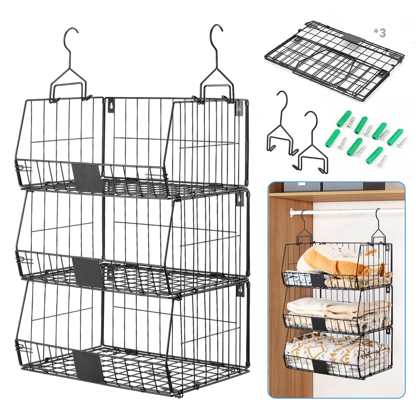 Fenghome 吊り下げラック 3個セット クローゼット収納 折り畳み式 2025新開発 衣類ラック 複数連結 吊り棚 コンパクトに折り畳める 戸棚下ラック 大容量 吊り下げ棚 収納ラック キッチン収納 ラック キッチン用 バスルーム用 台面整理 本置き つりとだな下収納 ラックひっかける 収納用品 しっかりしています (ブラック)