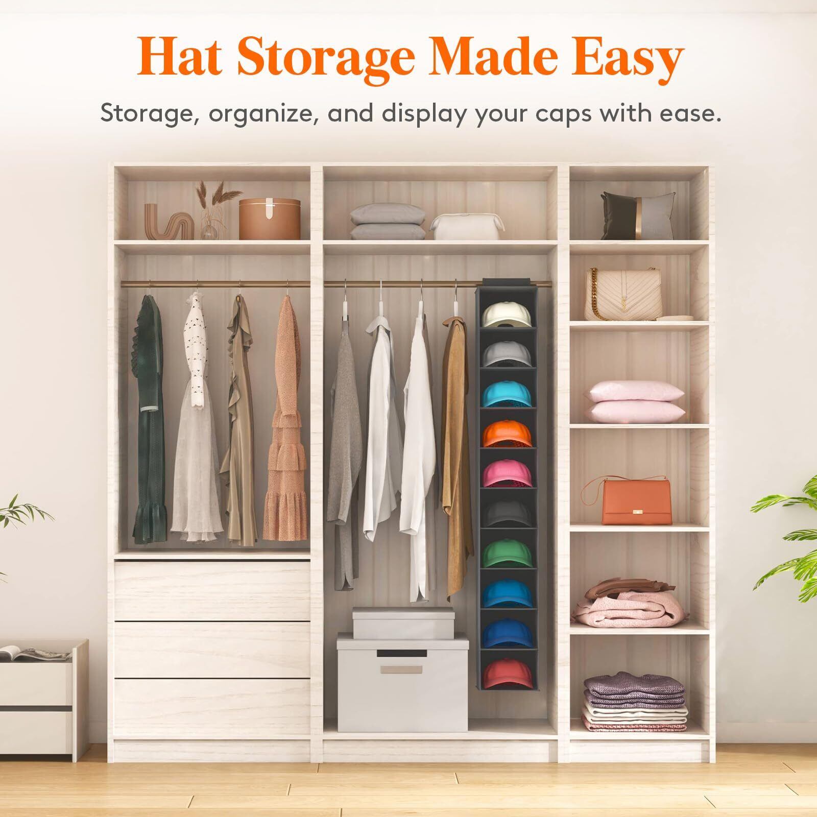 使いやすい:上部の留め具ストラップはあらゆるタイプのポールに接続でき、ポールに沿って簡単に移動できます。組み立てるには、帽子の収納バッグを広げて、上部の面ファスナーをクローゼットロッドの周りに固定するだけで、すぐに使用できます。