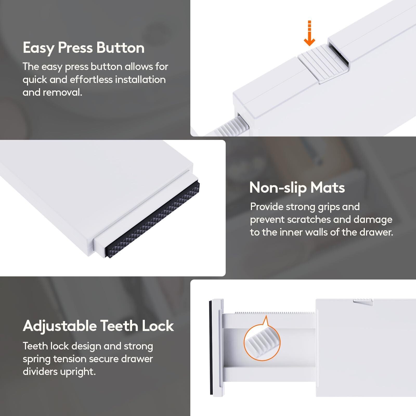 取り付けと取り外しがカンタン: 上部のボタンを押して長さを調節し、もう一度伸ばしてしっかりと固定してからロックします。バネの強力な張力により、ドロワーオーガナイザーはしっかりと直立します。収納するには、上部のボタンを押し、伸ばした側を押します。