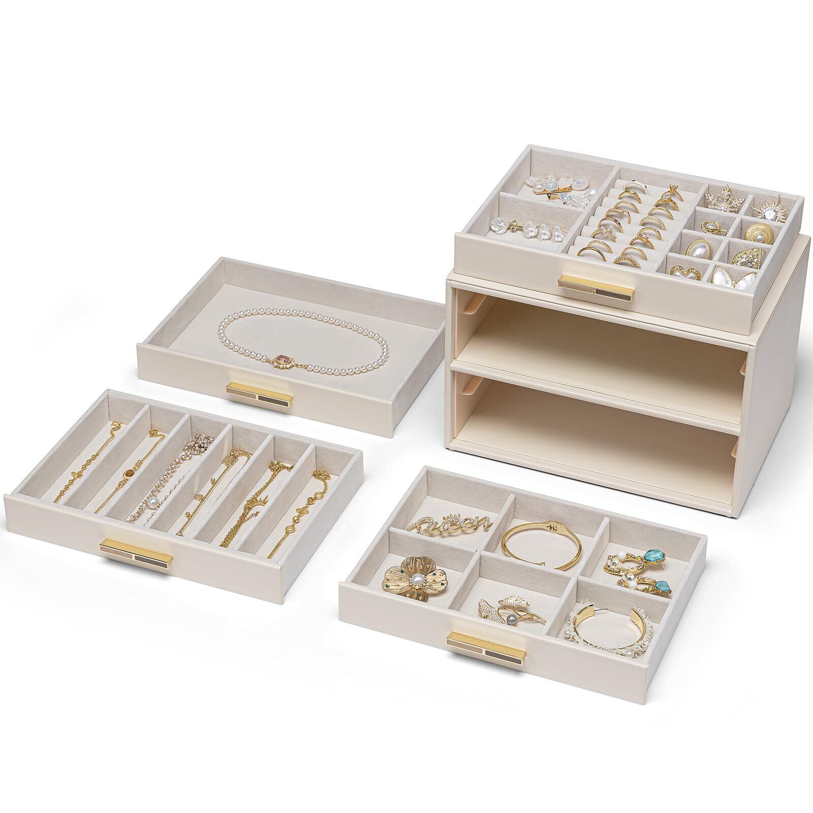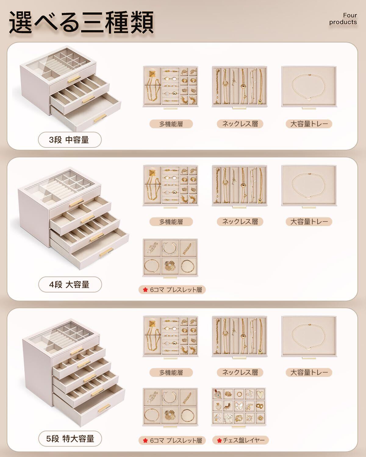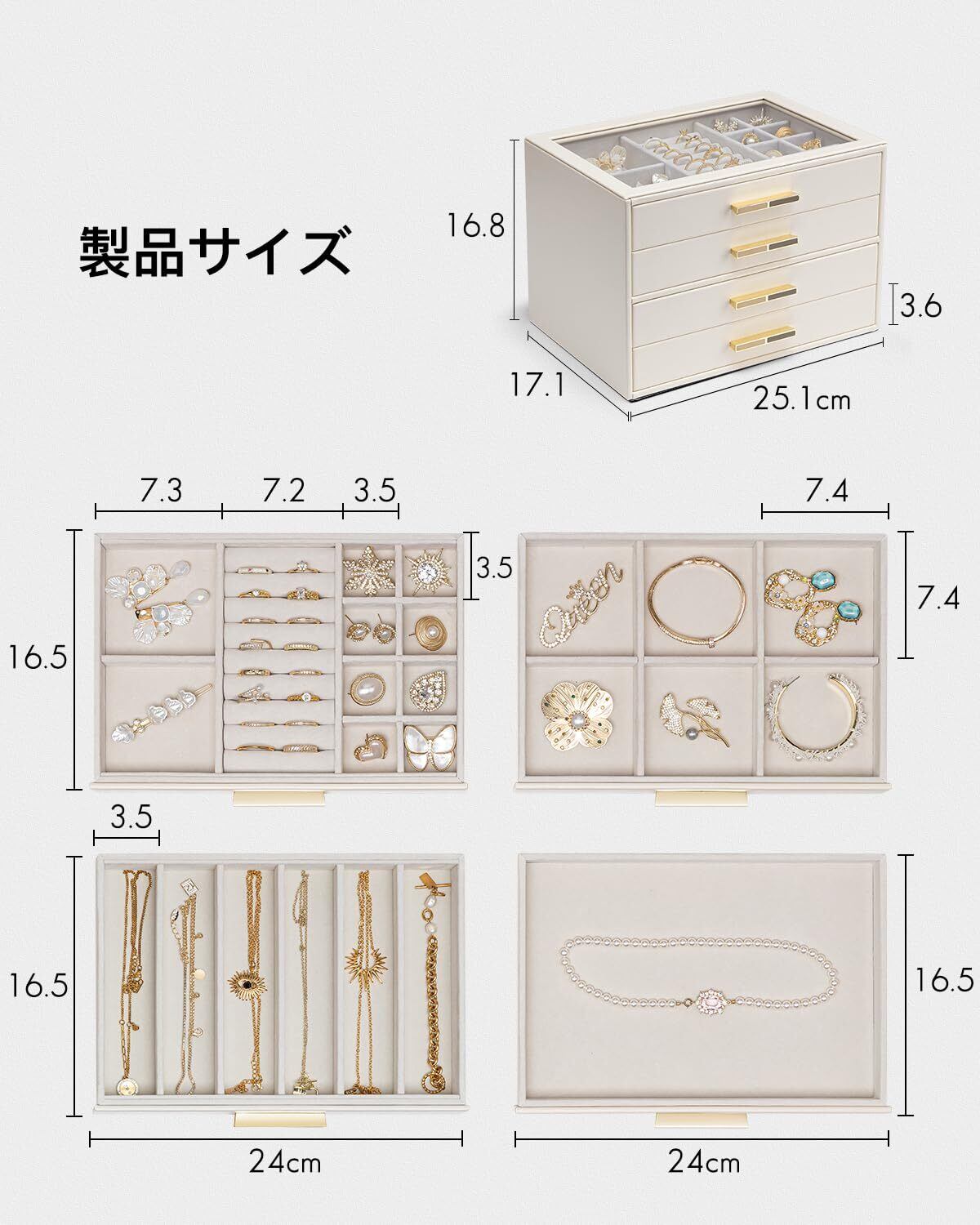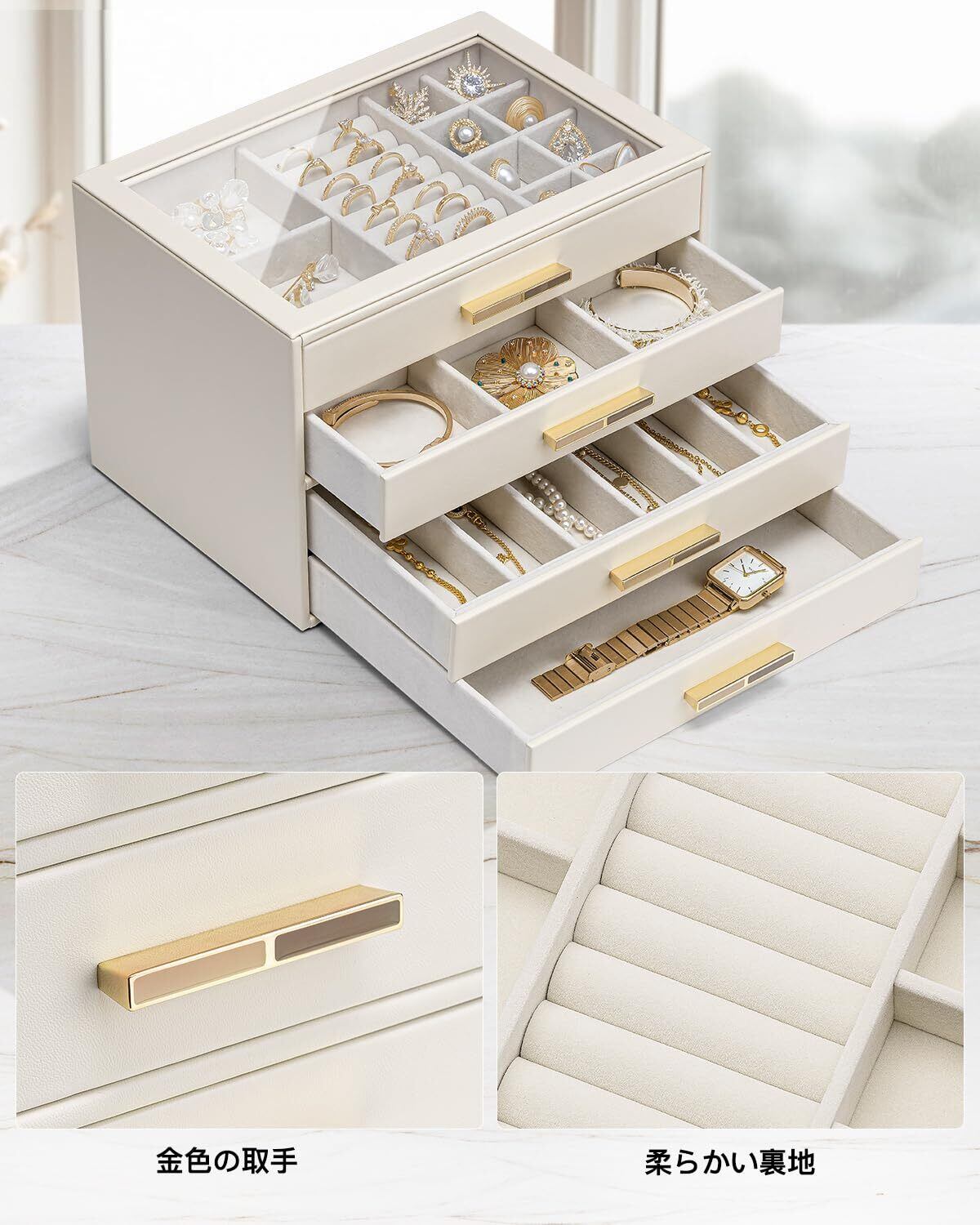 Vlando ガラス蓋 4段引き出し ジュエリーボックス 女性用ジュエリーボックス ネックレス 指輪 イヤリング ブレスレット アクセサリー収納用 オーガナイザー