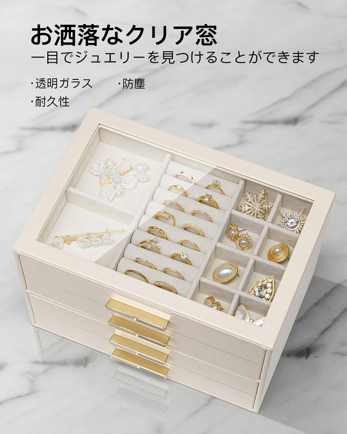 【 大きな透明な蓋 】 ガラスの蓋の下にお気に入りのジュエリーを収納して、いつでも一目で見つけられます。4層のジュエリーボックスには4つの引き出しとたくさんの仕切りがあり、金色の金具が付いています。上部と引き出しは簡単に開けられます。