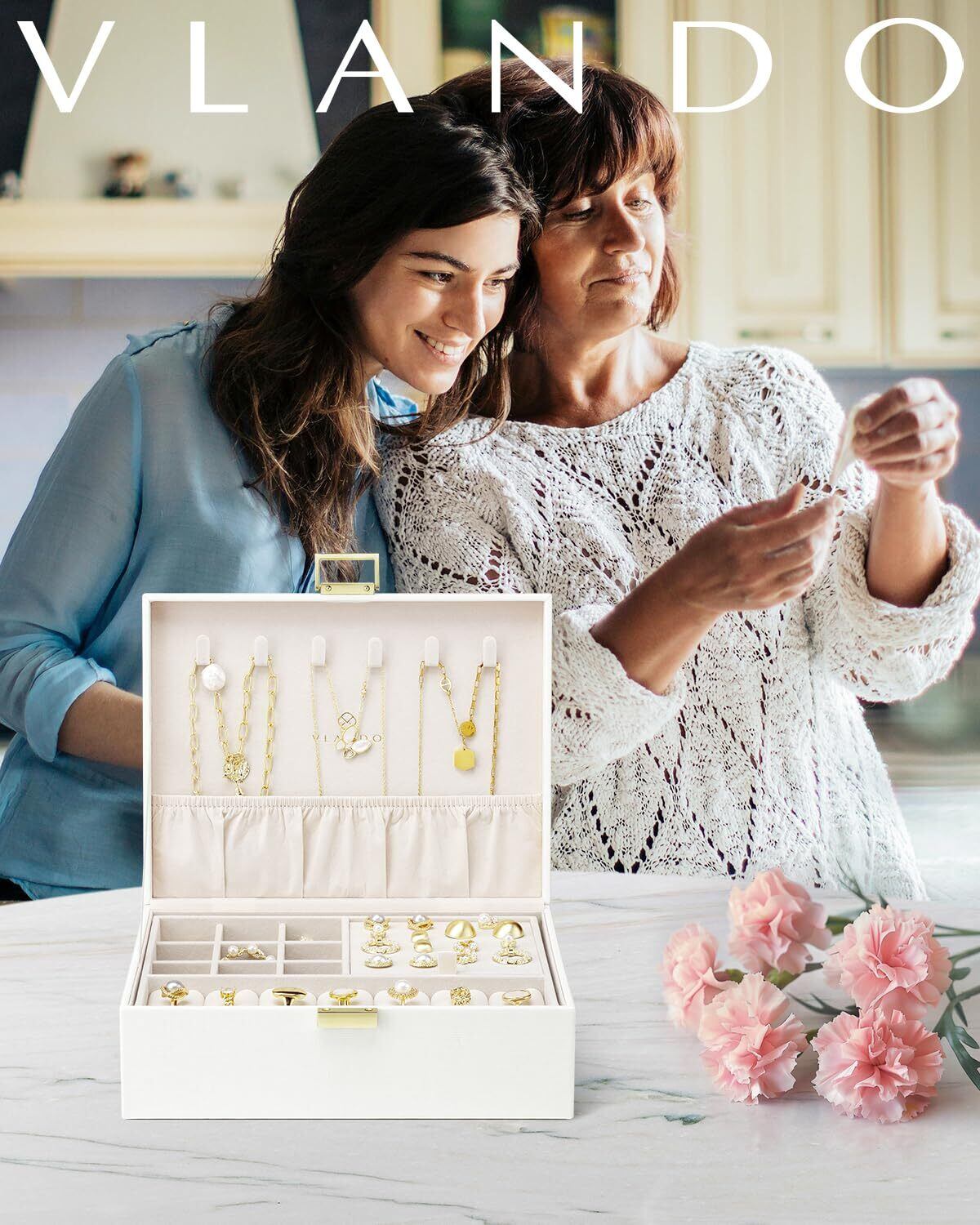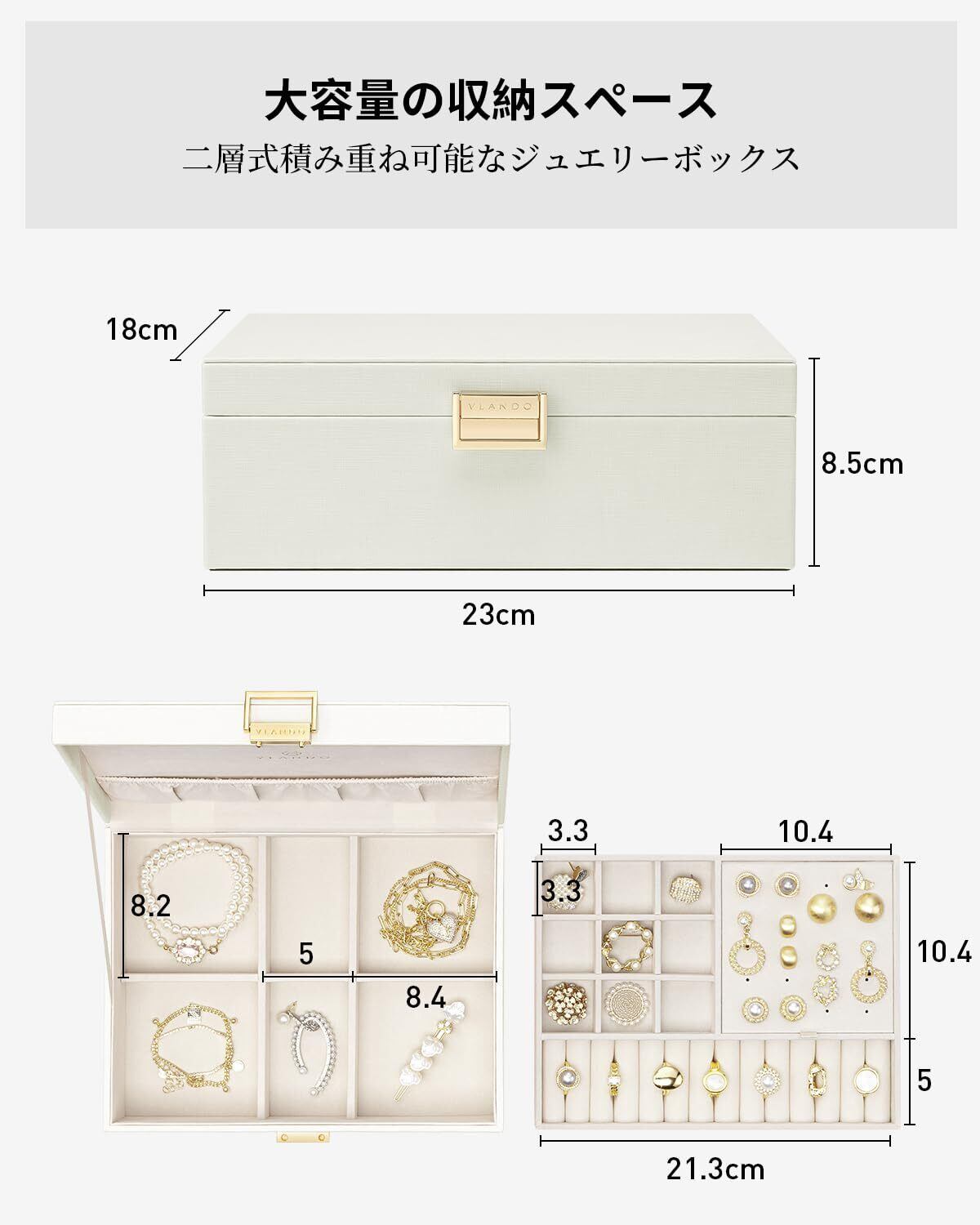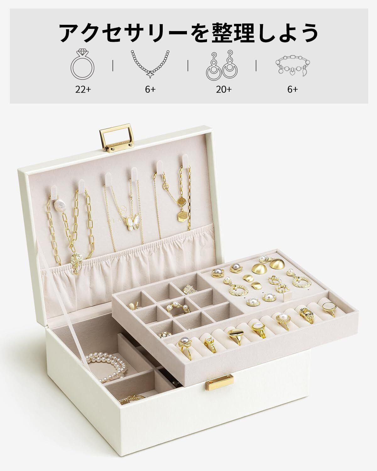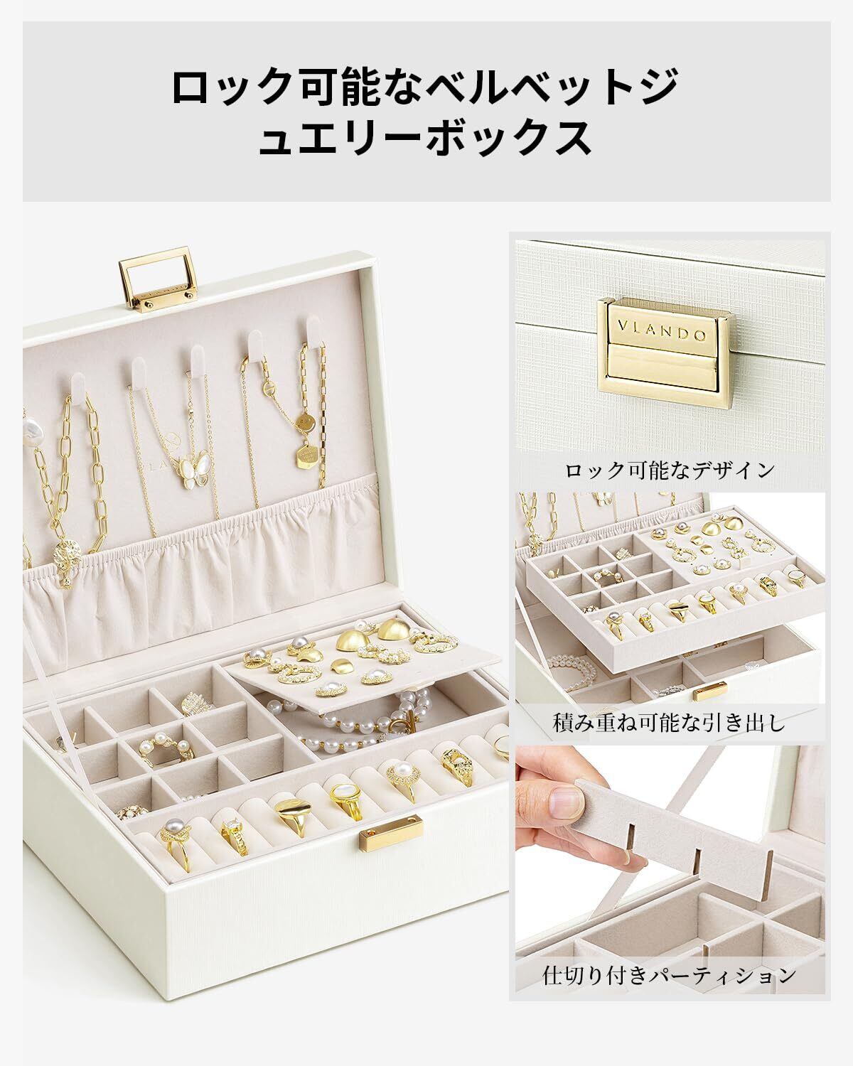 Vlando アクセサリーケース 2層 大容量 ジュエリーボックス 取り外し可能なジュエリートレー ネックレス ピアス 指輪 ブレスレット 女性 プレゼント 誕生日 ギフト (ホワイト)