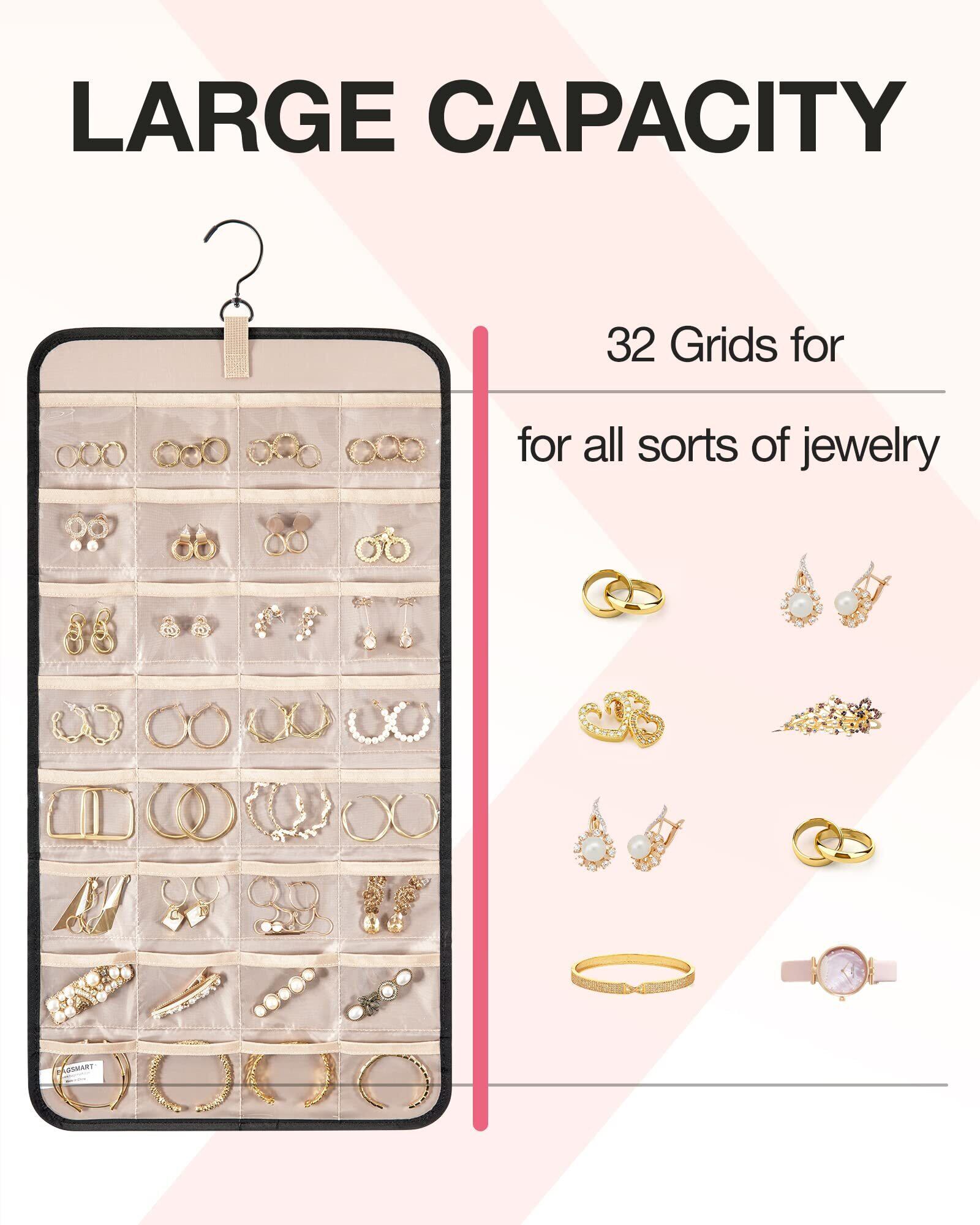 【大容量】両面吊り下げ式ジュエリーオーガナイザーは、ジュエリーを収納するための十分なスペースを提供します。32個の透明ポケットに指輪、イヤリング、ブレスレット、時計、ヘアピン、その他のジュエリーを収納可能で、反対側には最大28個のネックレスを収納できます。